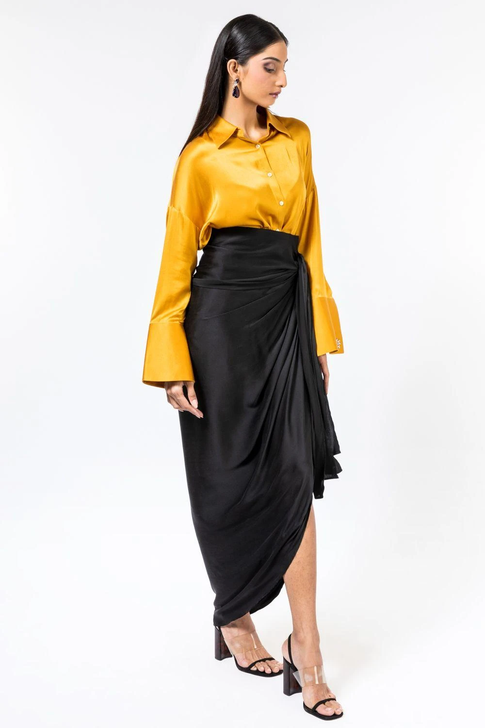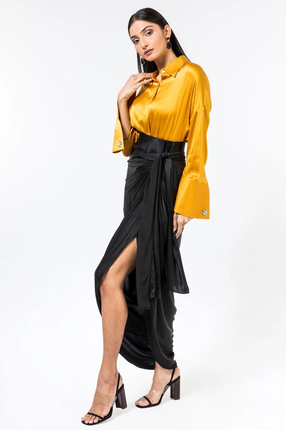 This black cowl drape skirt will fetch you a slinky look with its glove fit. It is cut in stretch satin with wrap detailing on the side. You can style it with a matching black top from the collection.