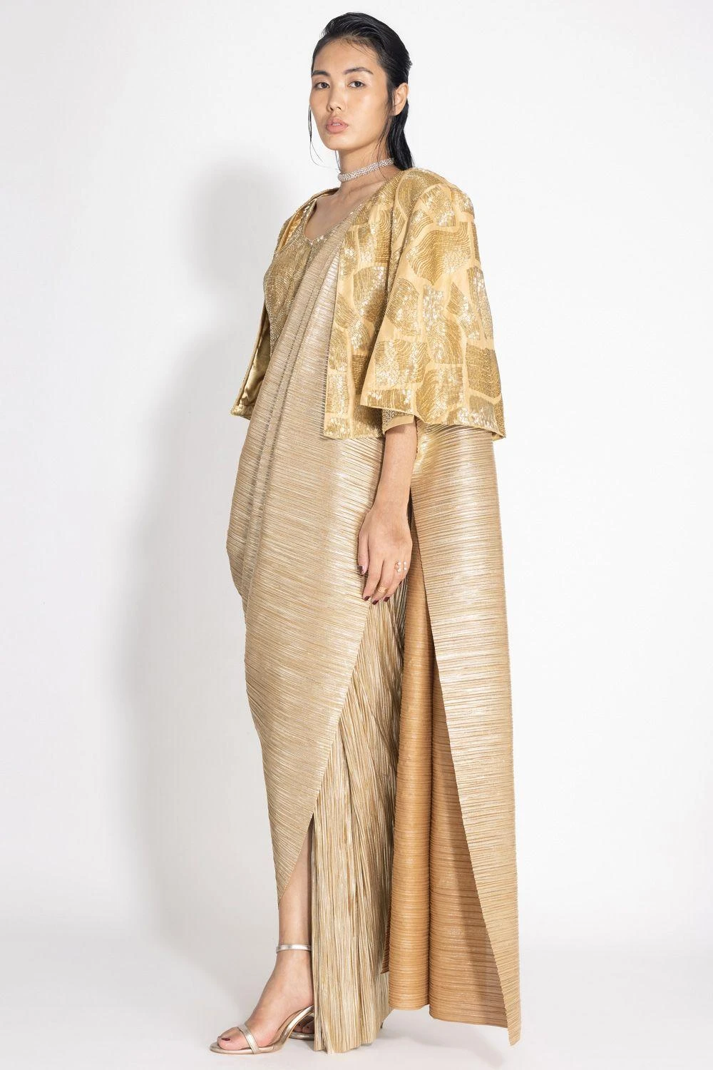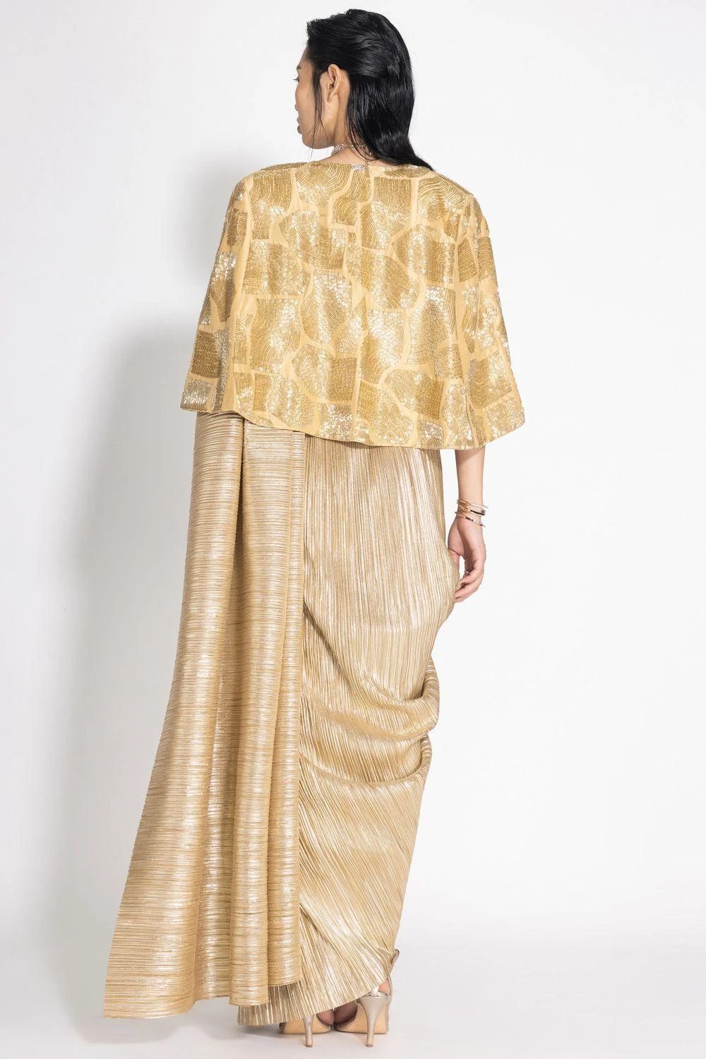 Luxe fabrication & flattering silhouette of this cape makes it a party essential. This short wave cape features floral embellished details all over. Pair it with a concept sari from the collection to complete the set.