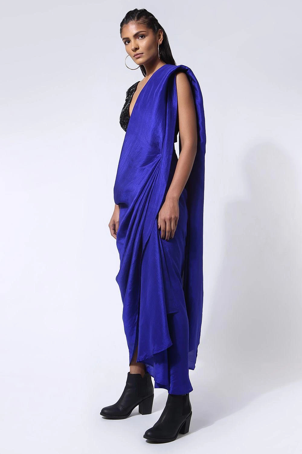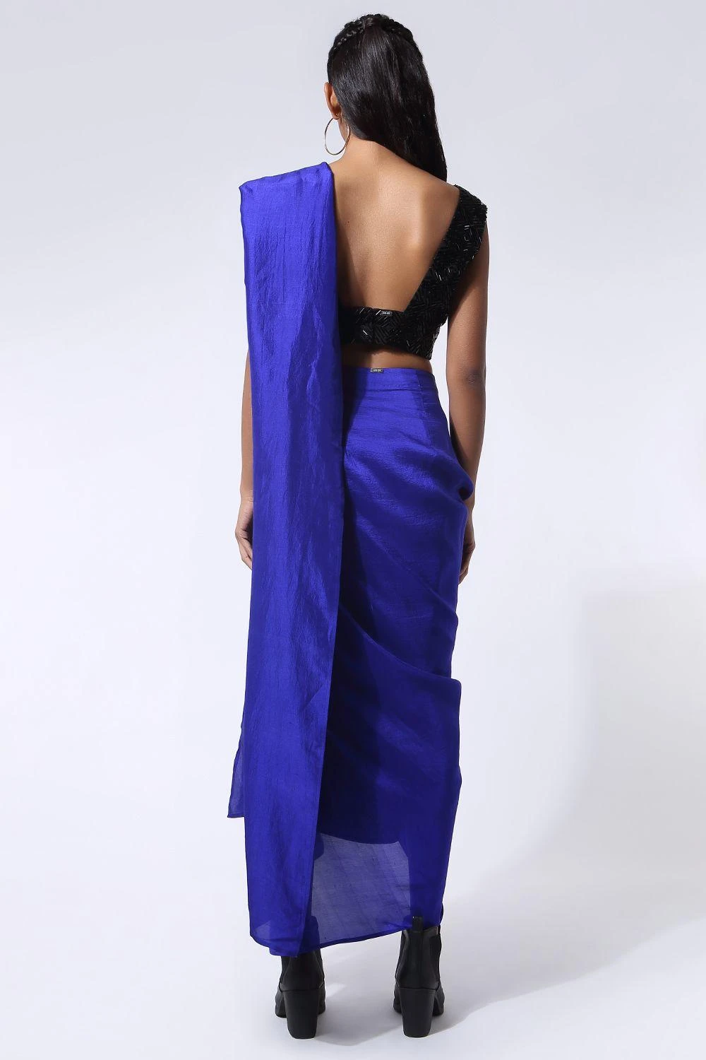 In a vibrant electric blue, this pre-pleated concept sari is effortlessly stylish. Wear it with a full embroidered blouse offered by the brand and statement earrings. Watch for the side button on the waistband which gives a crisp fall to the palla.
