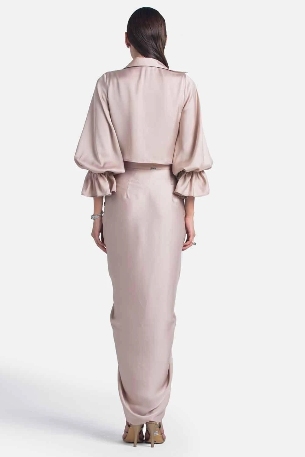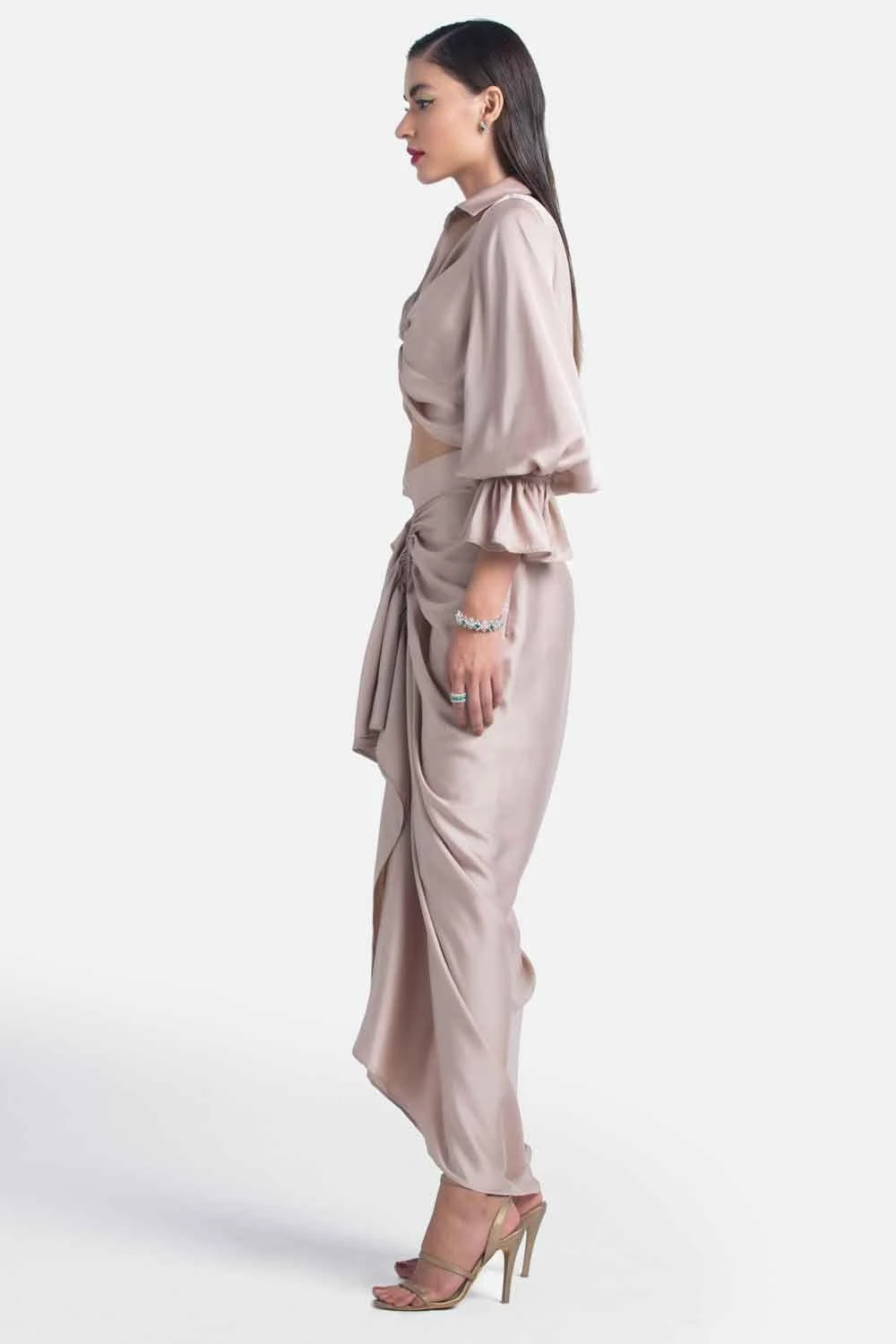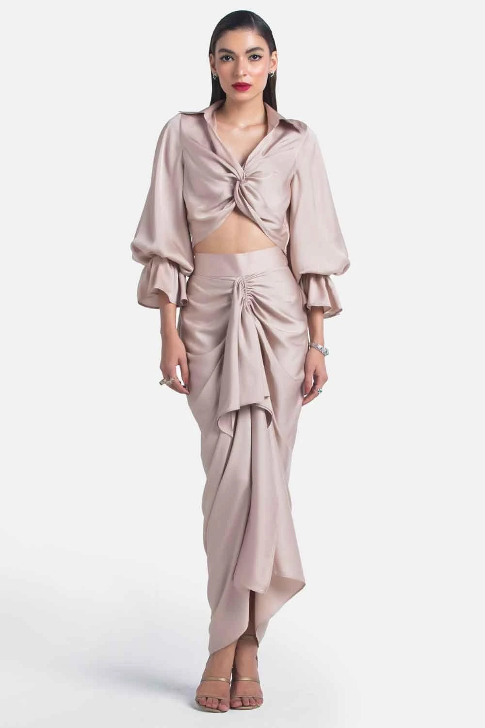 This nude drape skirt will fetch you a slinky look with its glove fit. It is cut in satin with ruch & drape detailing in the centre. You can style it with a matching top from the collection.