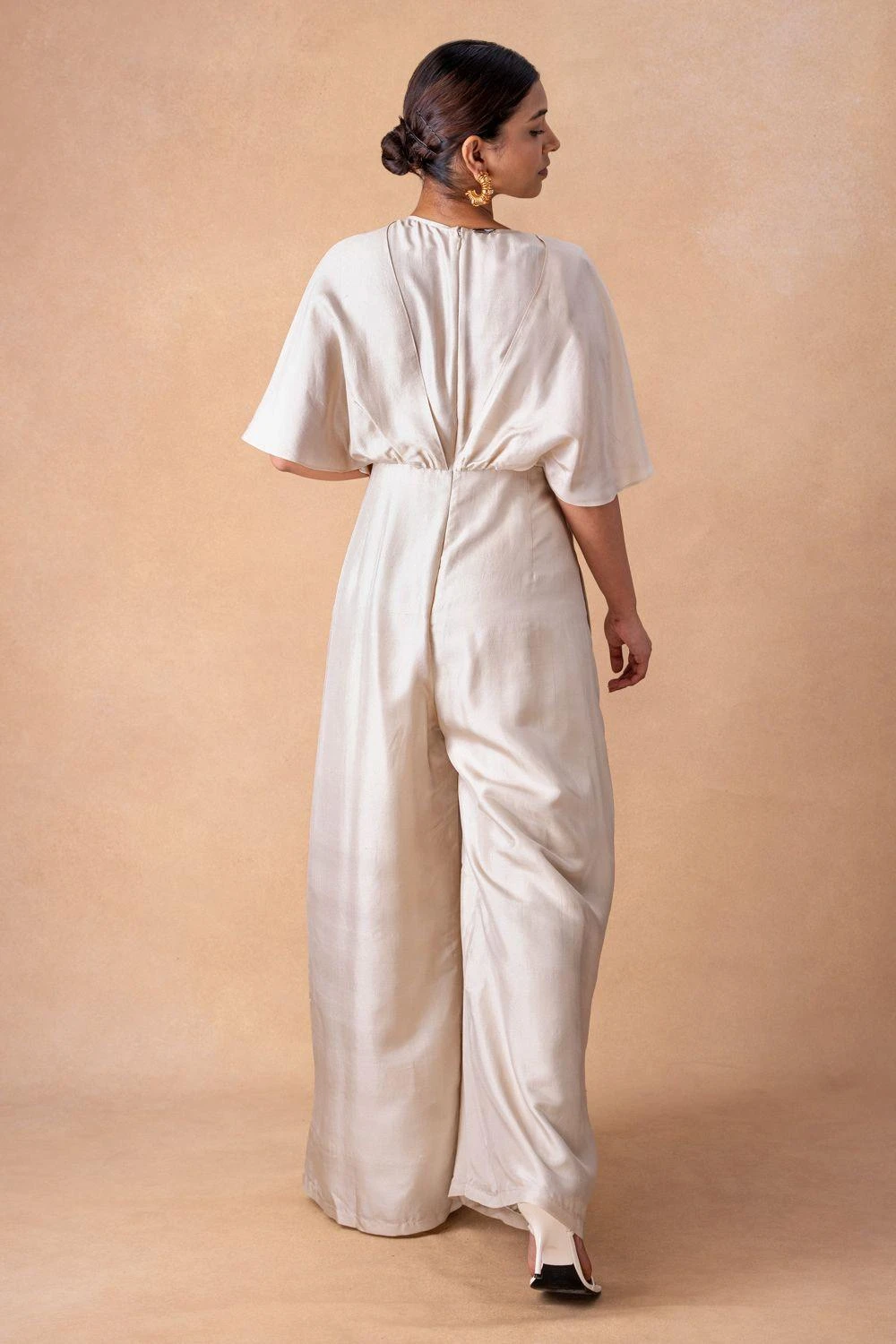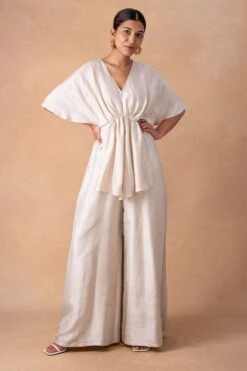 Embrace radiance in the Ivory Silk Draped Jumpsuit, adorned with exquisite drape details. A symphony of elegance, this piece invites you to indulge in a luxurious narrative of style and sophistication.