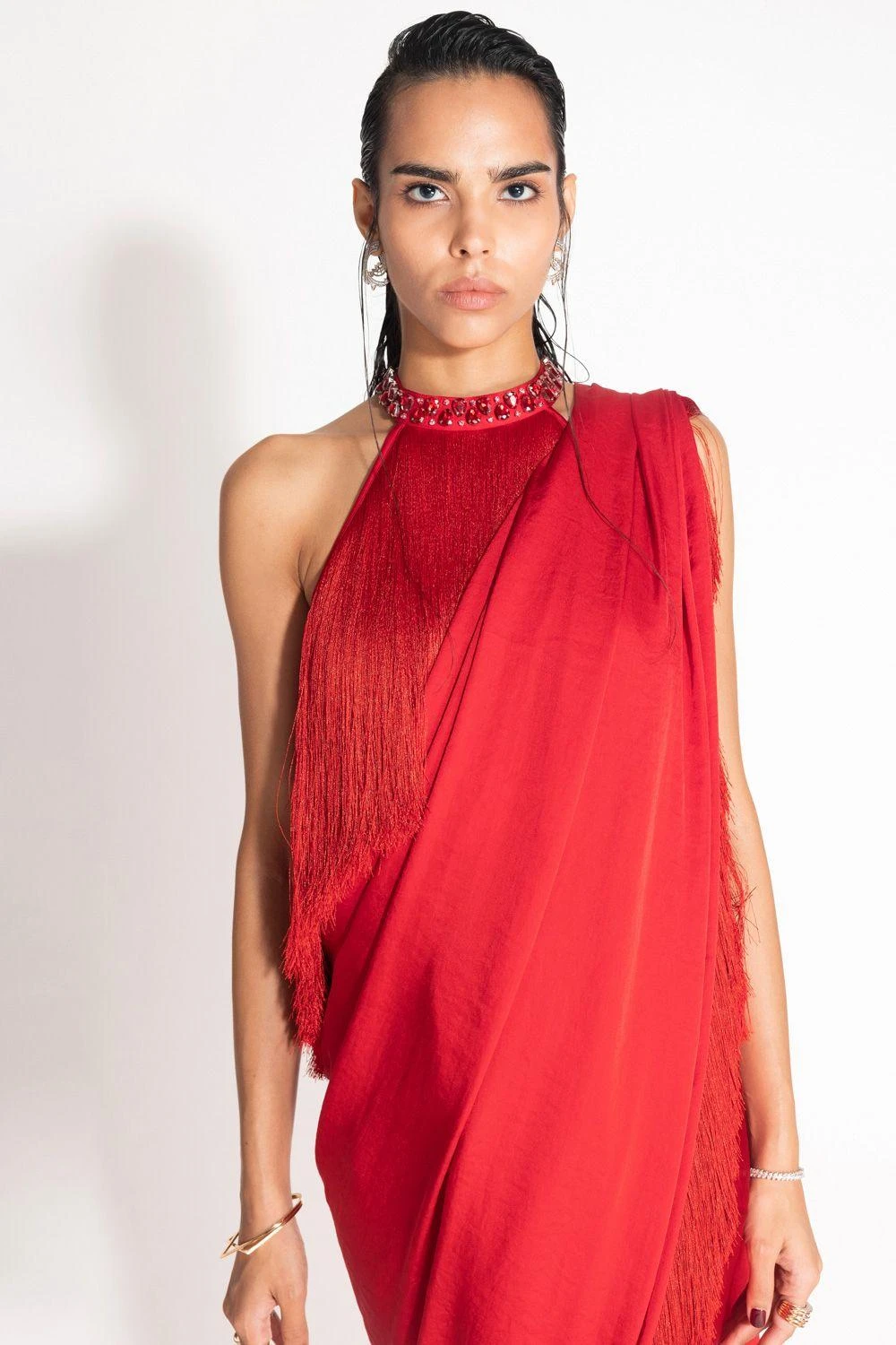 If you’re looking for a head-turning statement-making outfit, this concept sari is for you. This set features a pre-draped sari with a fringe detail paired with a jewelled halter top. Style it with a pair of dangler earrings to complete the look.