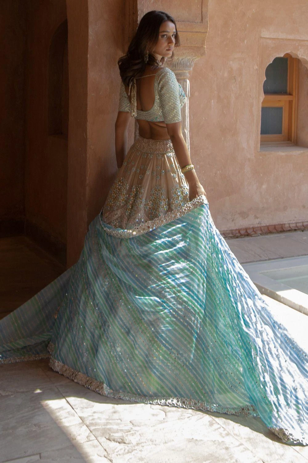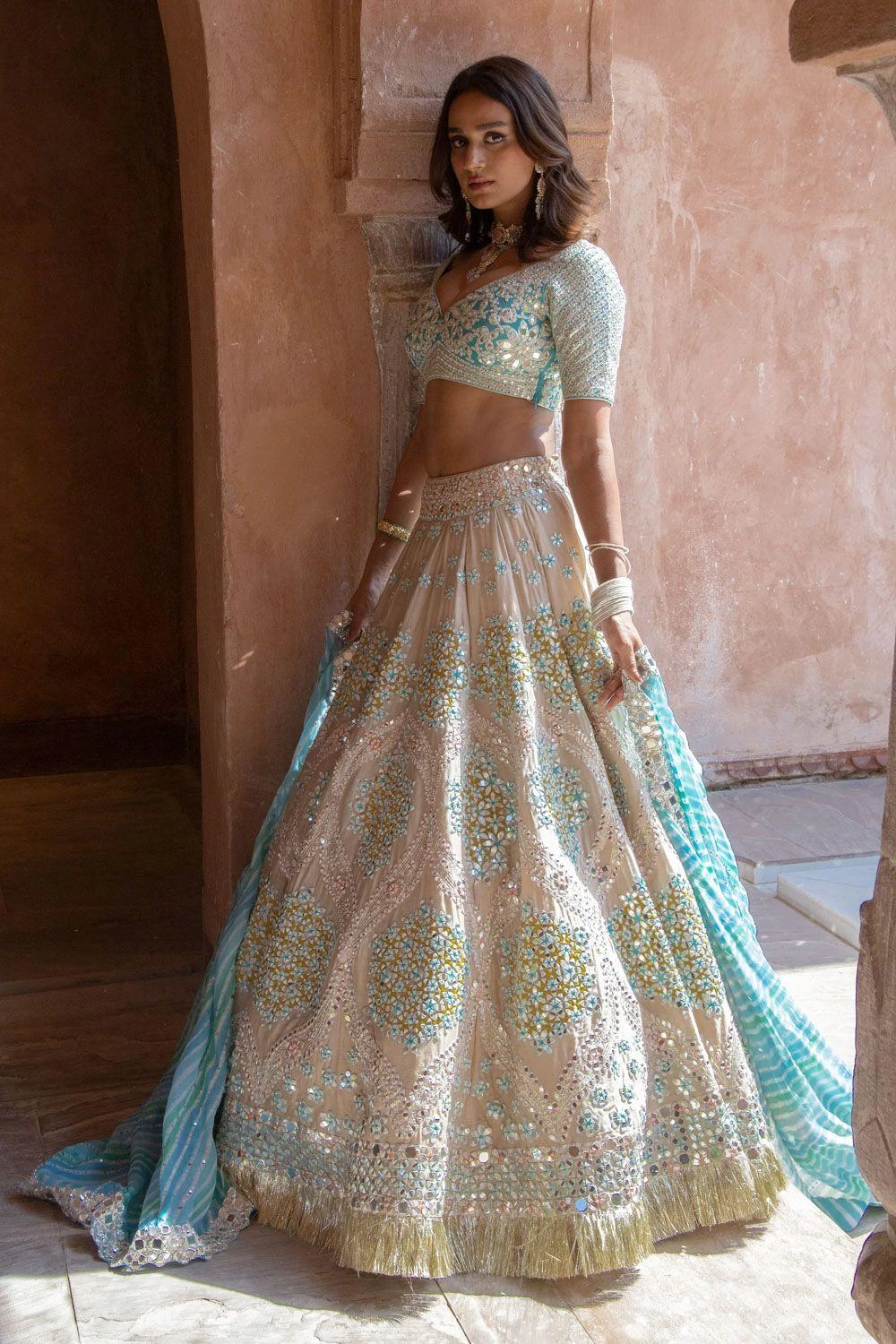 Step into the realm of exquisite beauty with this mirror embellished lehenga set. The intricately adorned blouse, featuring stunning mirror work, harmonizes effortlessly with the lehenga & dupatta, creating a mesmerizing ensemble.