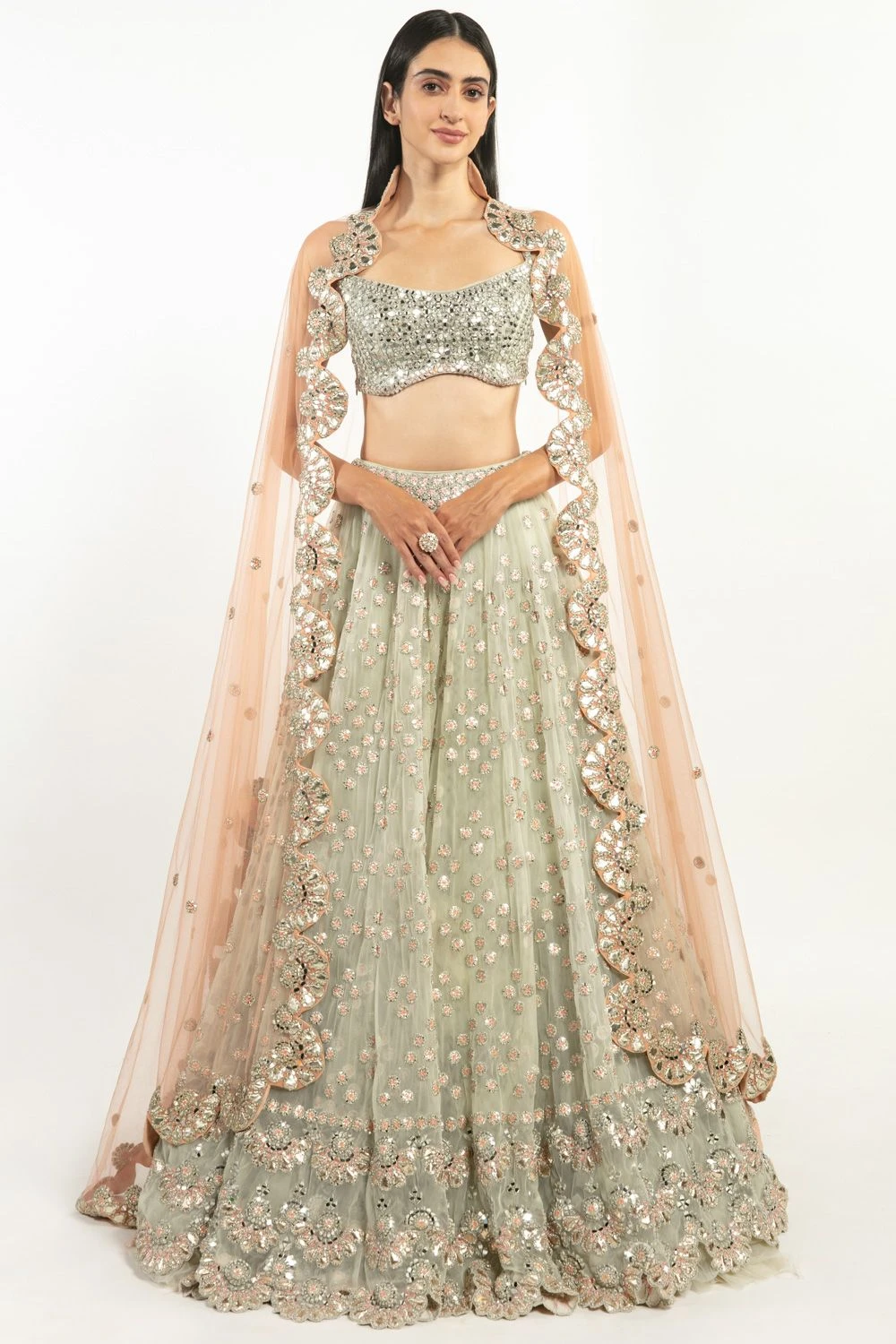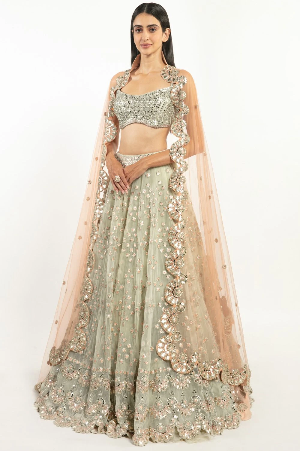Featuring Abhinav Mishra’s signature mirror work, this lehenga set is the perfect for this wedding season.Crafted in net, it comes with an embellished lehenga & blouse & a dupatta. This set is further highlighted with gota, resham, zari embroidery