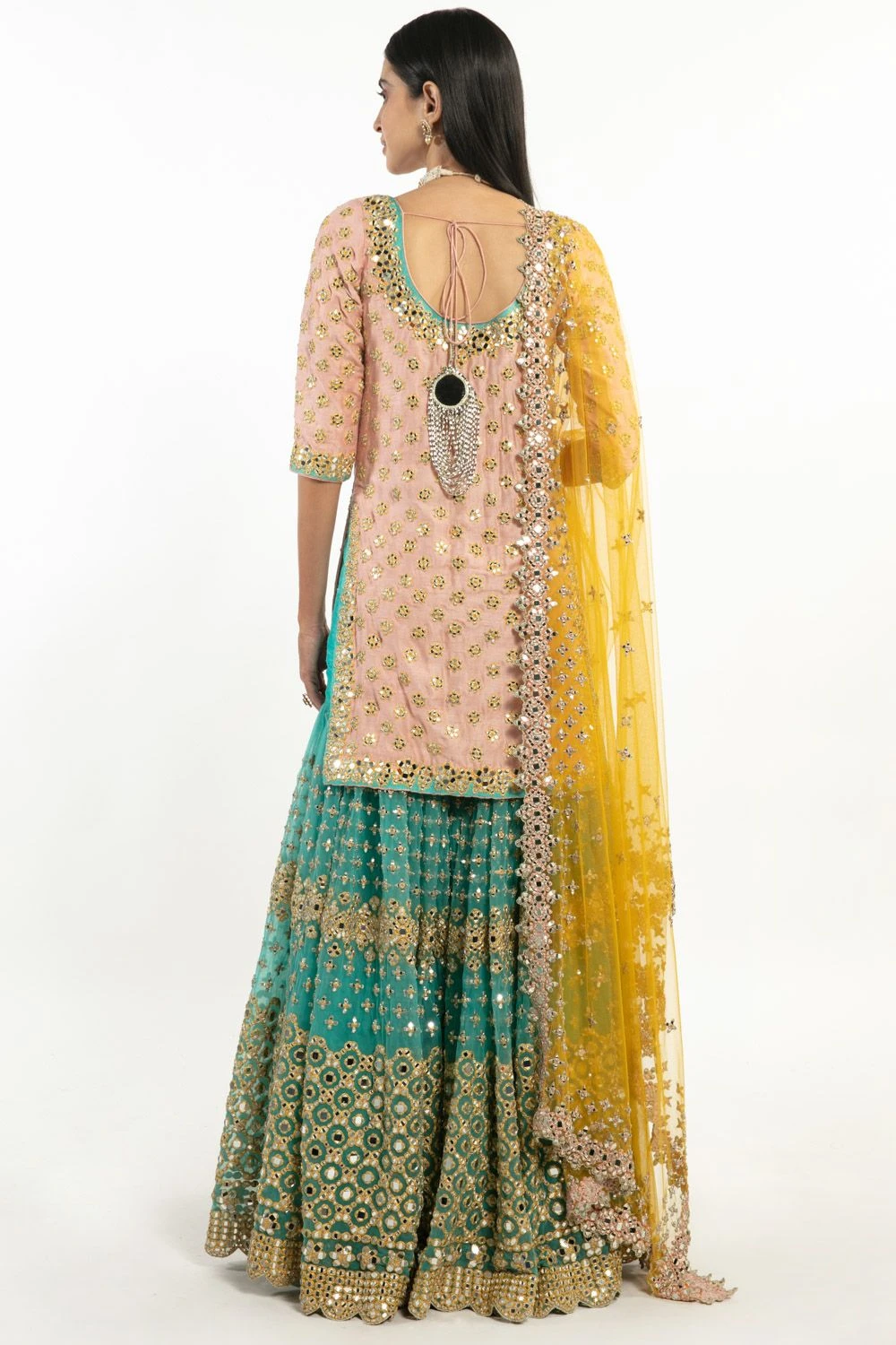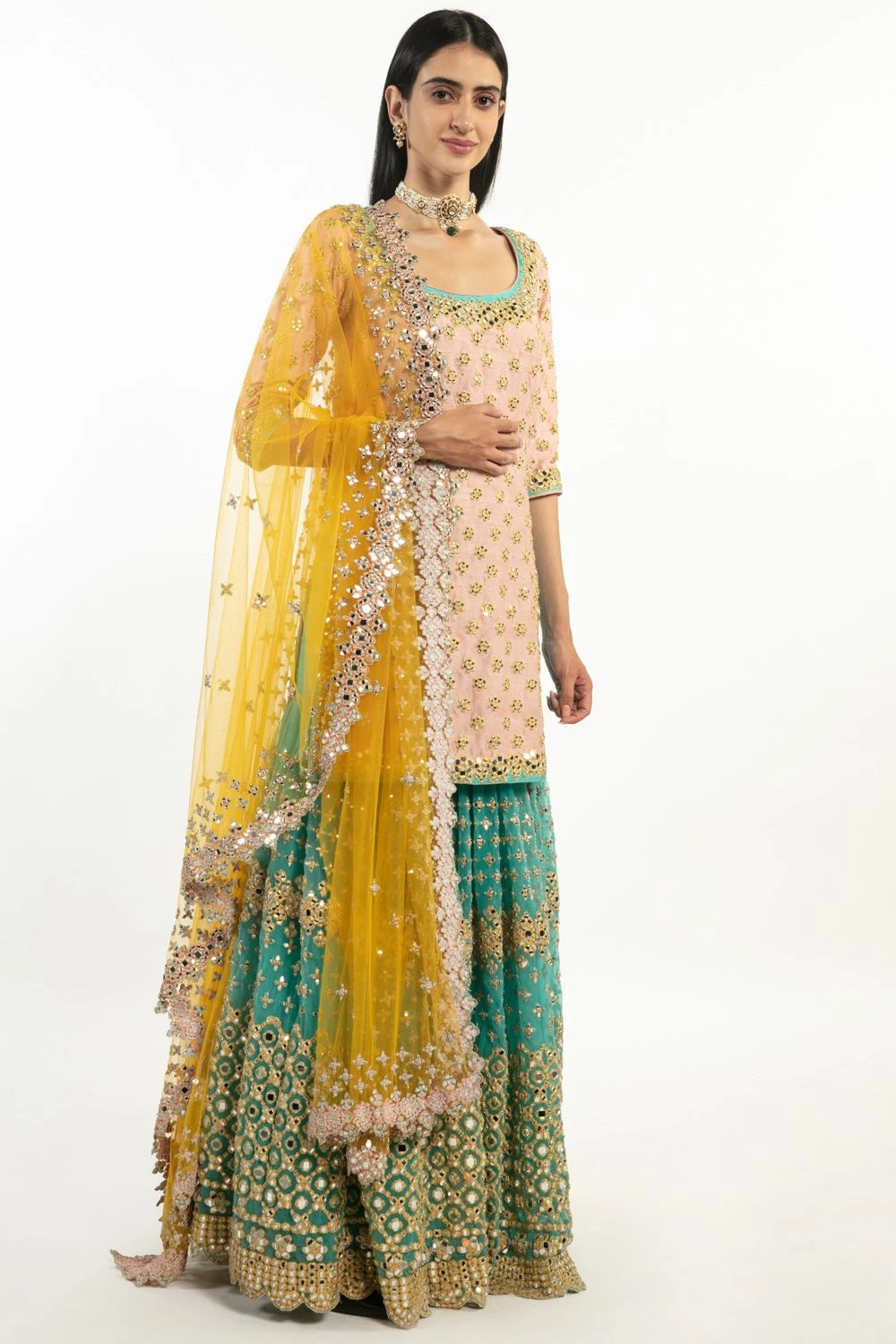 Featuring Abhinav Mishra’s signature mirror work, this lehenga set is the perfect for this wedding season. It comes with an embellished kurta paired with a sharara & dupatta. Style it with statement earrings & a potli bag to complete the look.