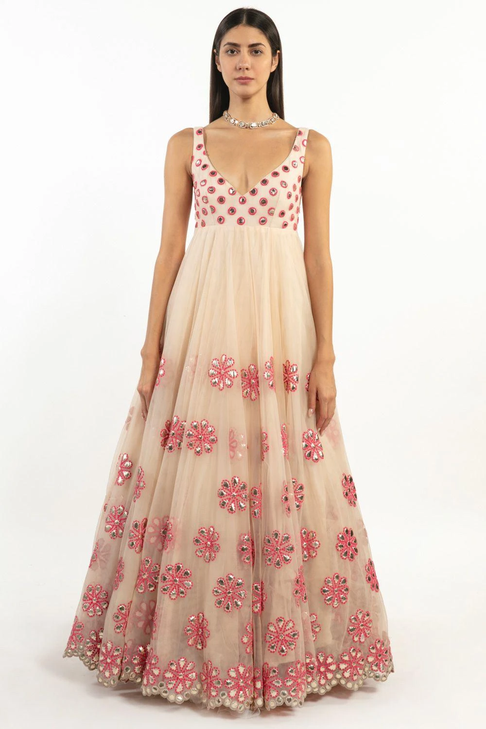 Featuring Abhinav Mishra’s signature mirror work, this anarkali set is the perfect for this wedding season.Crafted in net, it comes with a resham embellished anarkali & dupatta. Style this set with a pair of statement earrings to complete the look.