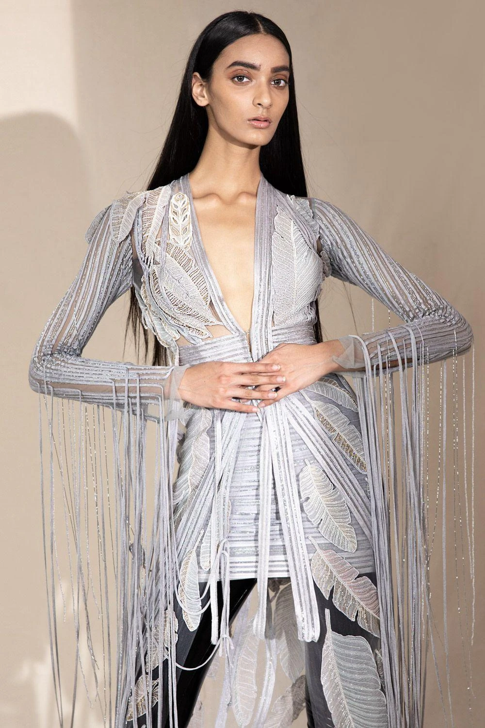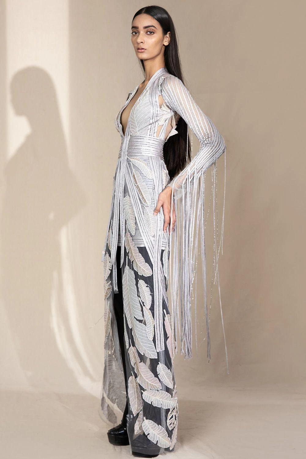 This 3D appliqued pencil cut jacket & short skirt set is perfect for dressy events. It has 3D applique work, silk thread & cutdana embroidery. Style this statement look with statement earrings & a clutch.