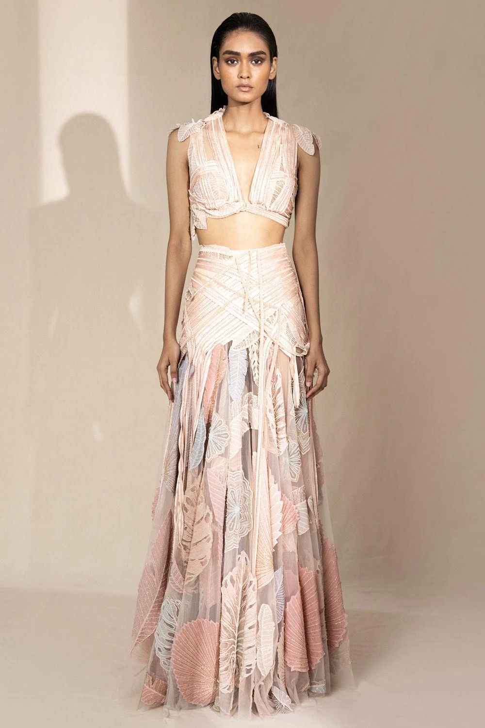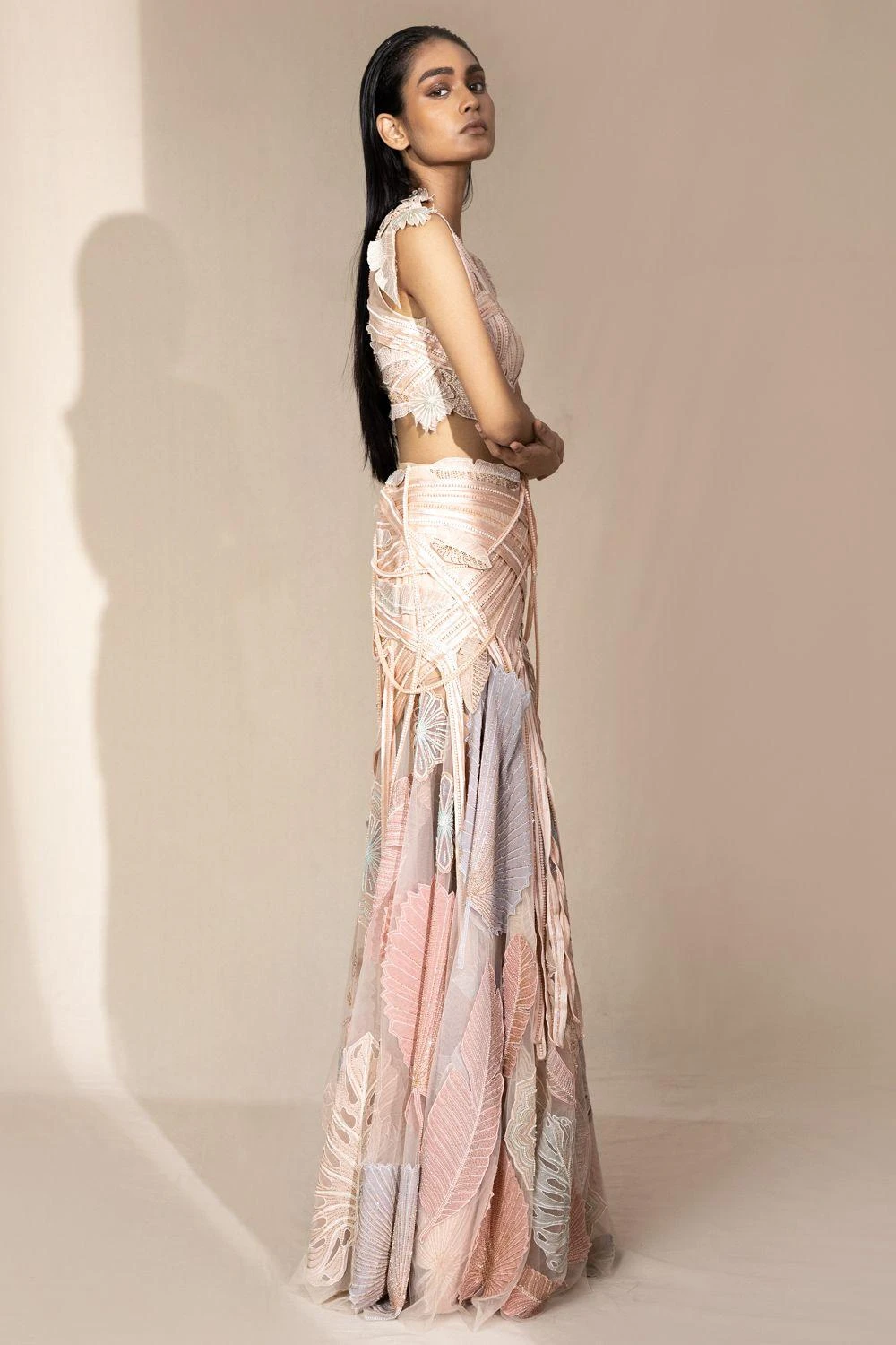 This graphic line detailed crop top and highwaisted skirt is embellished with 3D leaf applique and bugle bead work. It has draped embroidery detailing that highlights the beauty of the outfit.