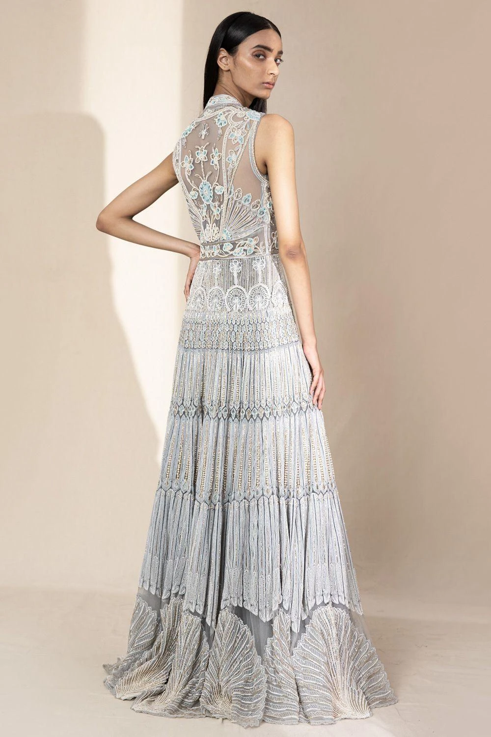 This multi paneled floor length jacket is embellished with fine dori pearl and bugle bead detailing teamed up with a flared skirt. The shoulder has fine pearl string detailing on the shoulder.
