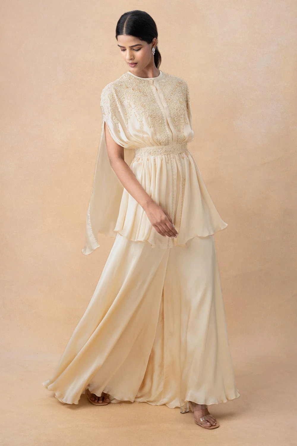 Summer festivities call for easy-breezy outfits like this cape set. This cape features crystal embellishments and comes with a pair of pants, a crop top and a belt. You can team it up with a pair of elegant statement earrings to complete the look.