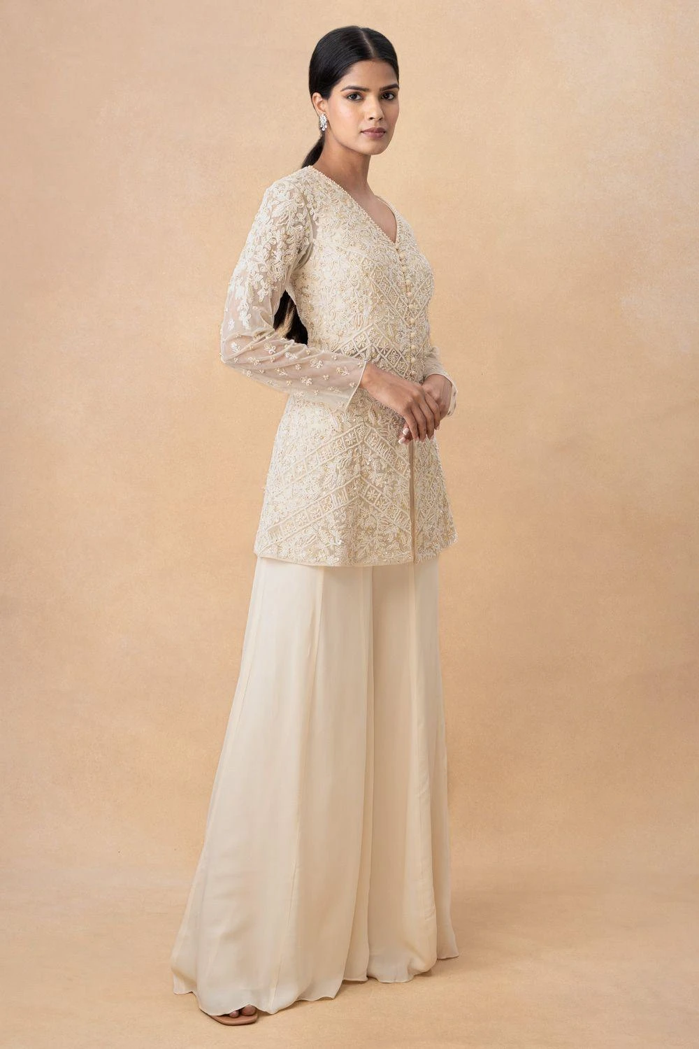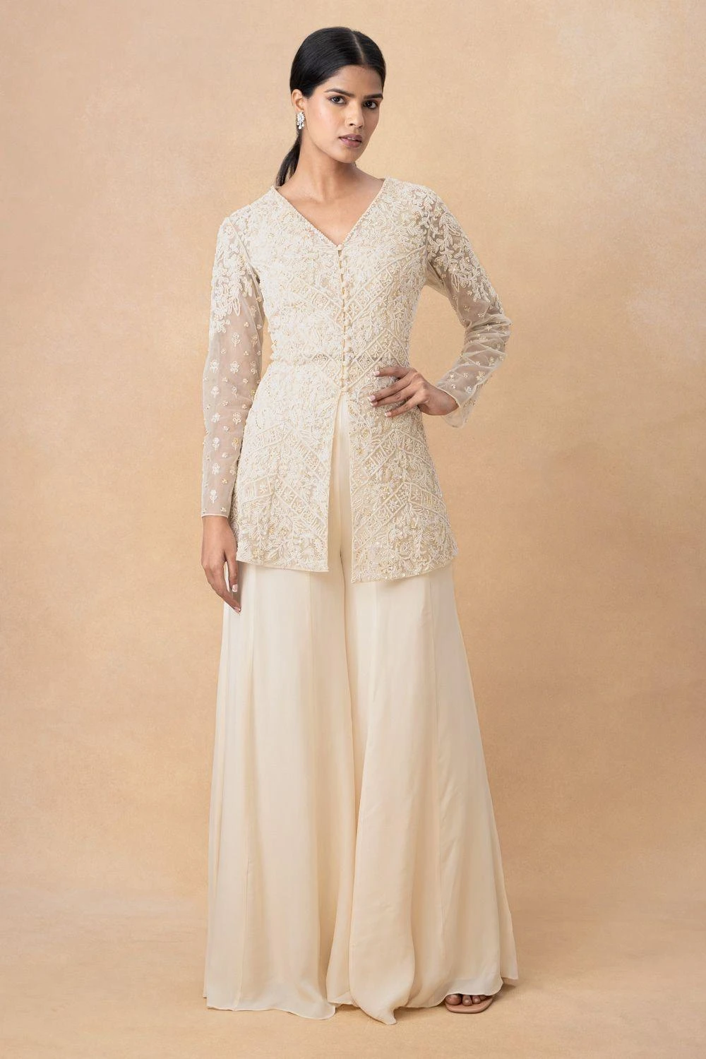 Step into a world of regal charm with this thread-embellished sharara set. Intricately crafted, this set features a floral embellished kurta paired with a sharara. You can team it up with a pair of elegant statement earrings to complete the look.