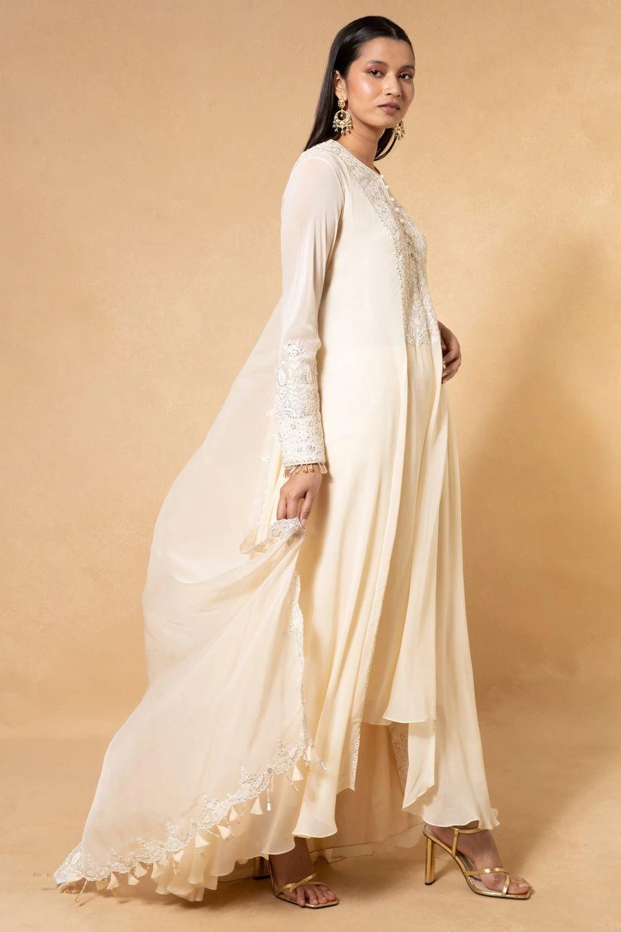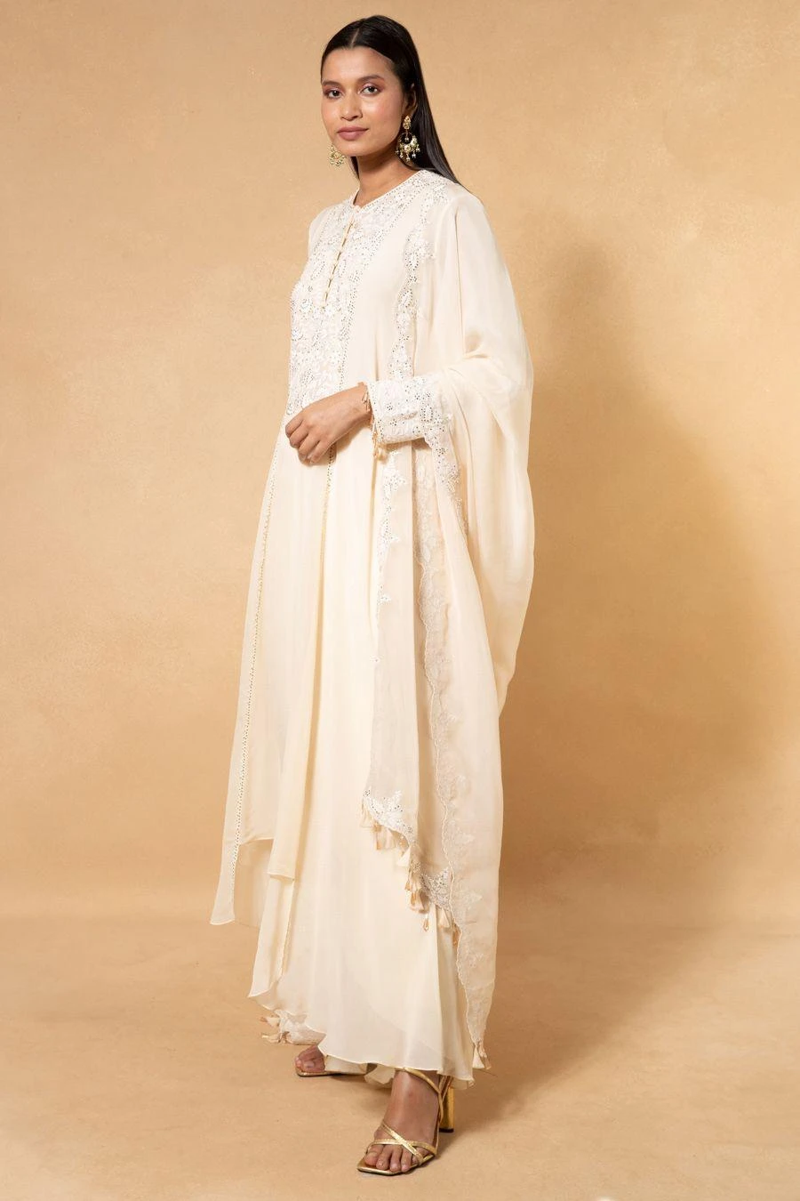 This kurta set will see you through all kinds of celebrations, this wedding season. Crafted in georgette, this set features a dori work, floral embellished kurta paired with a dupatta, pants & an inner.