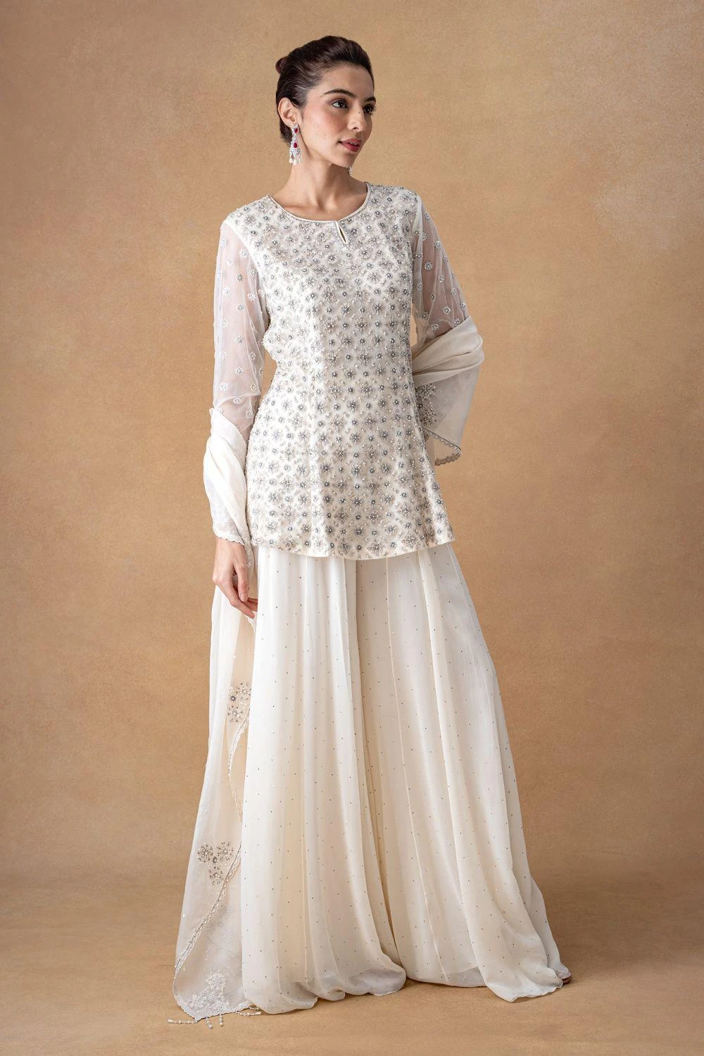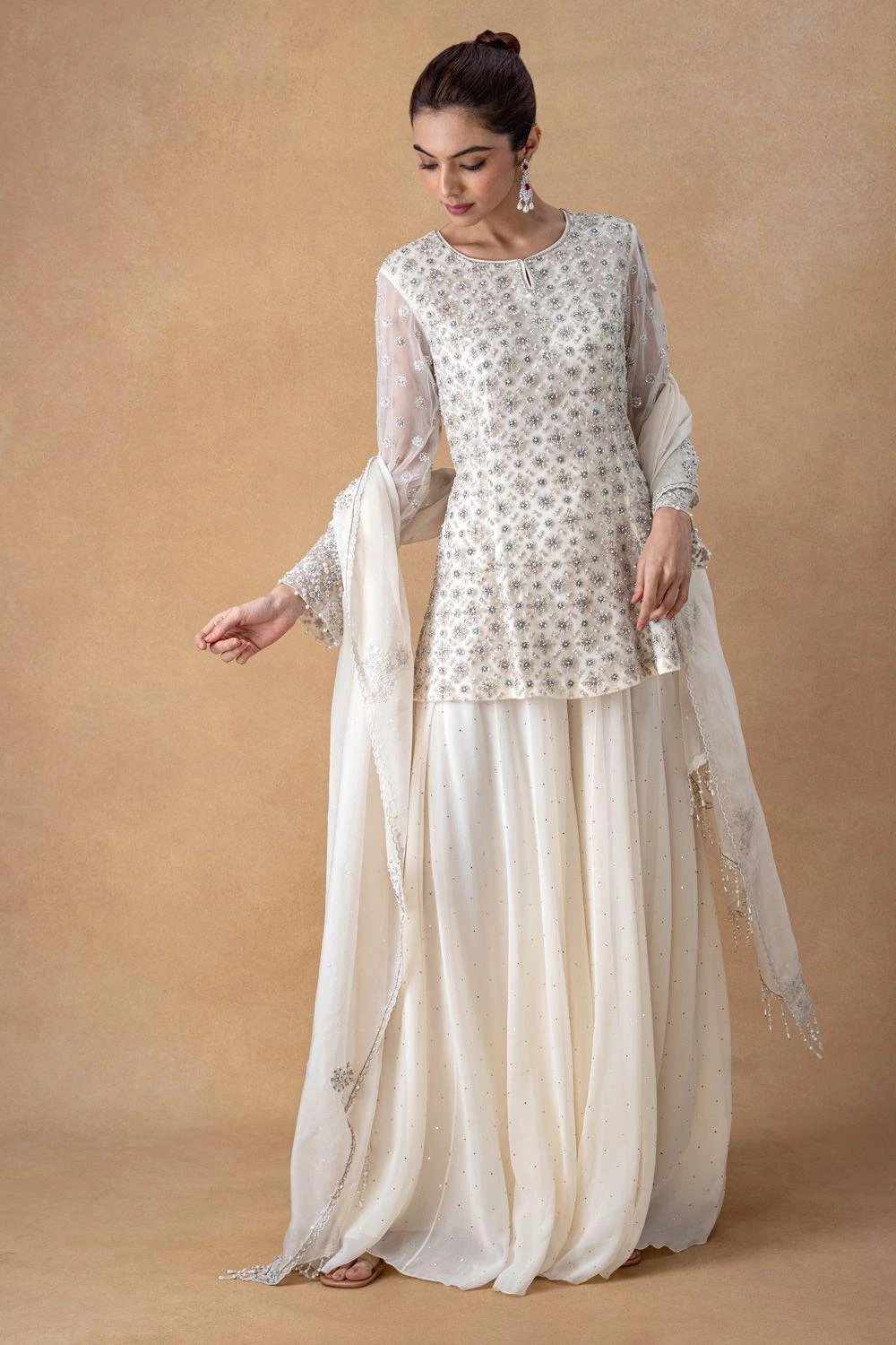 Indulge in luxury with the Delicate Ivory Floral Kurta-Sharara Set. Fashioned in georgette, adorned with pearls & sequins, this ensemble features a charming kurta, paired elegantly with a sharara & a graceful dupatta. Elevate your style with allure.