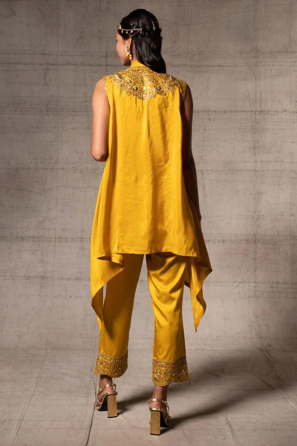 This playful yellow dupion silk kurta set comes with a sleeveless asymmetric jacket & straight pants. It is embellished with reverse kasab embroidery on the neckline & golden fringe details.
