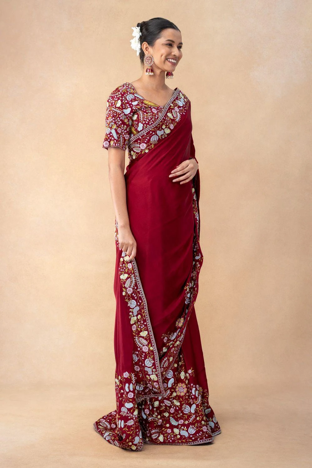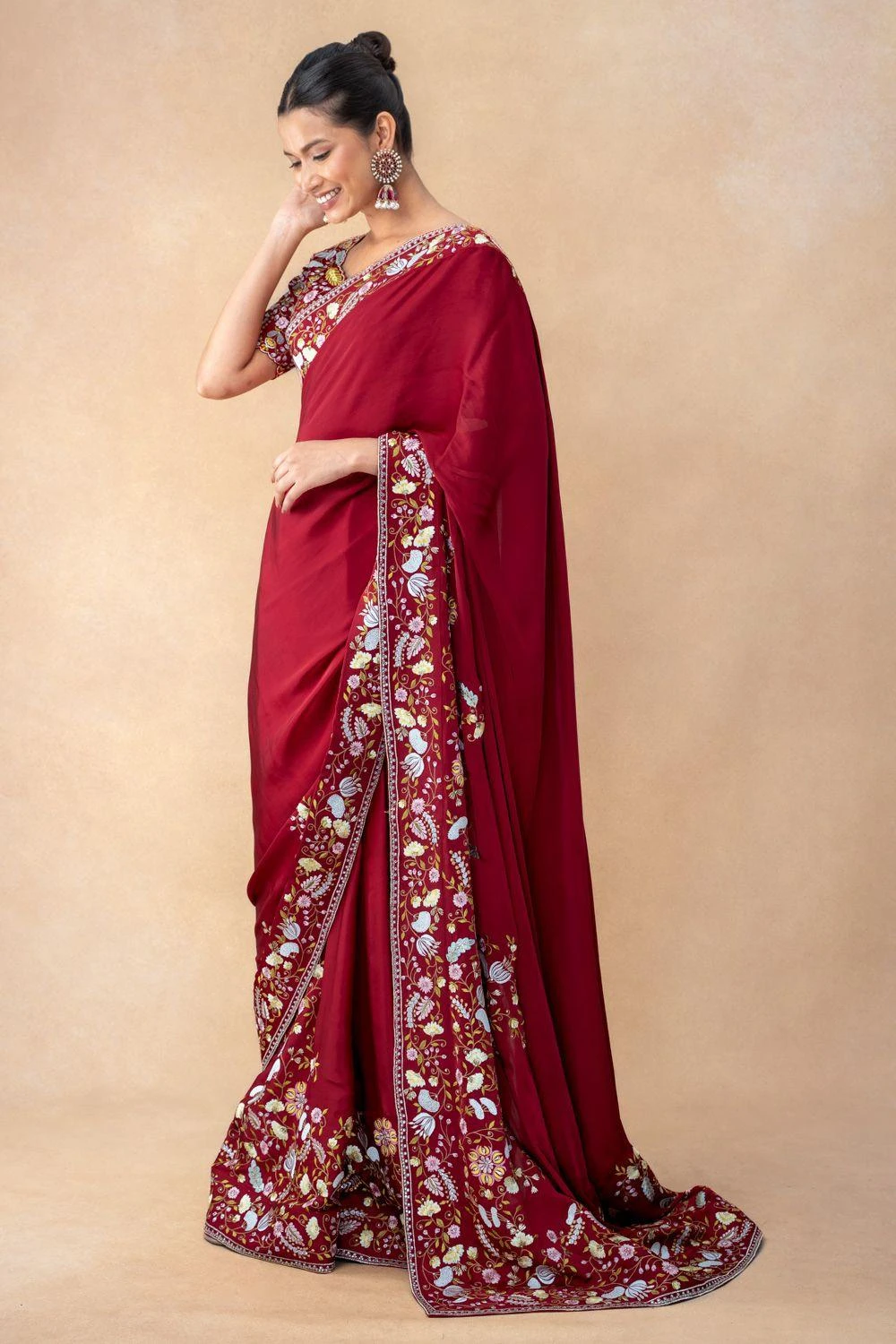 Indulge in the allure of this red thread embellished sari set. A masterpiece of intricate artistry and captivating charm.