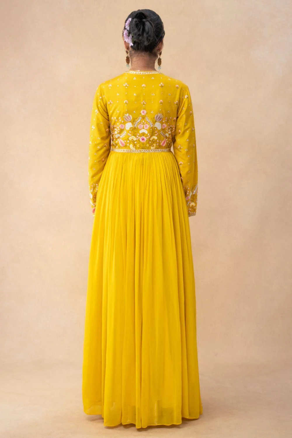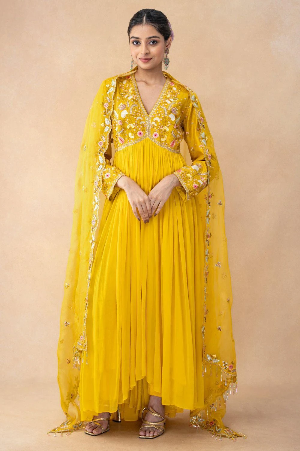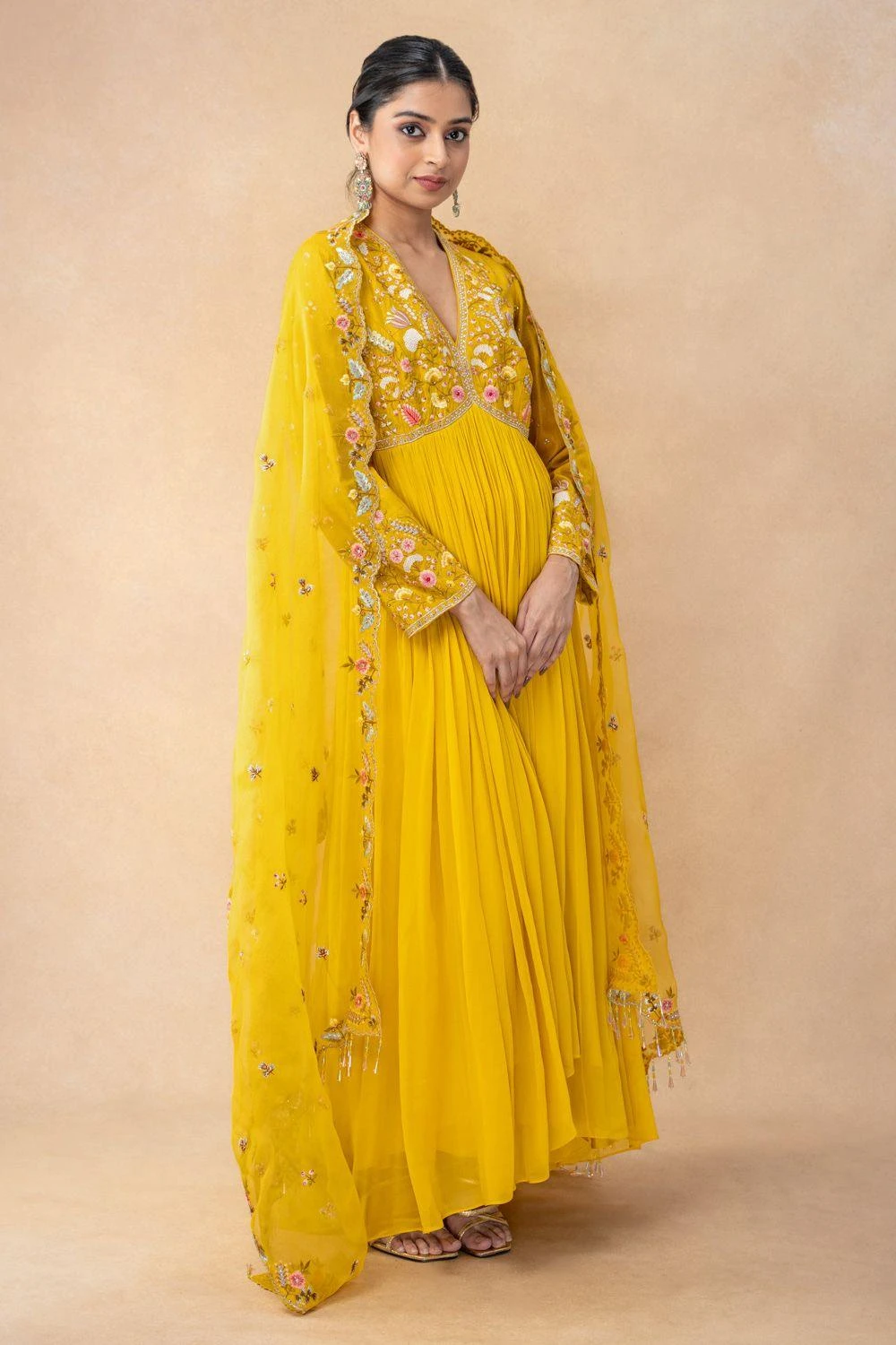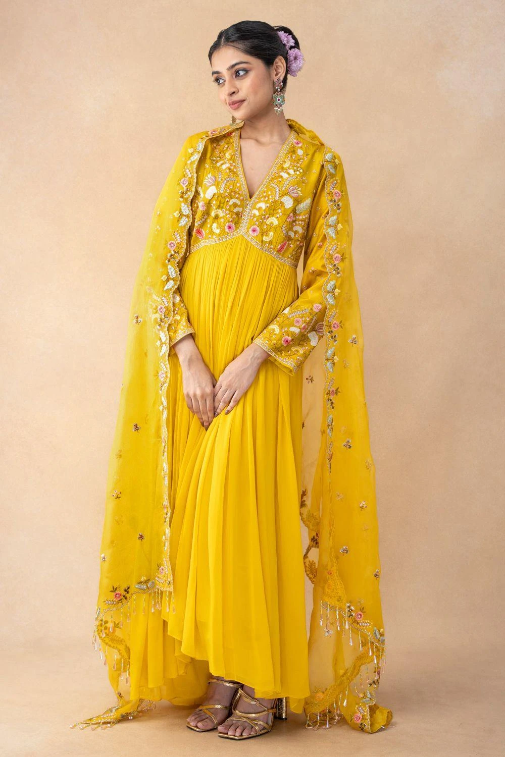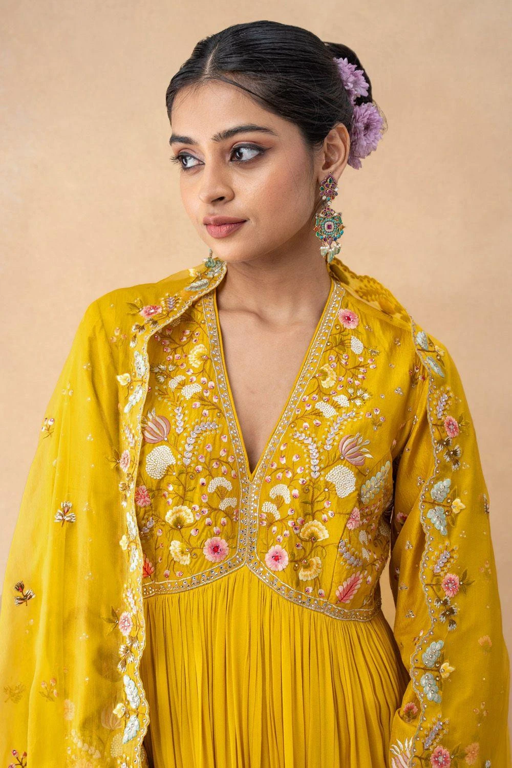 Step into a world of timeless elegance with this floral embellished anarkali set. Paired with a coordinating dupatta & pants, this set is a mesmerizing blend of grace and opulence.