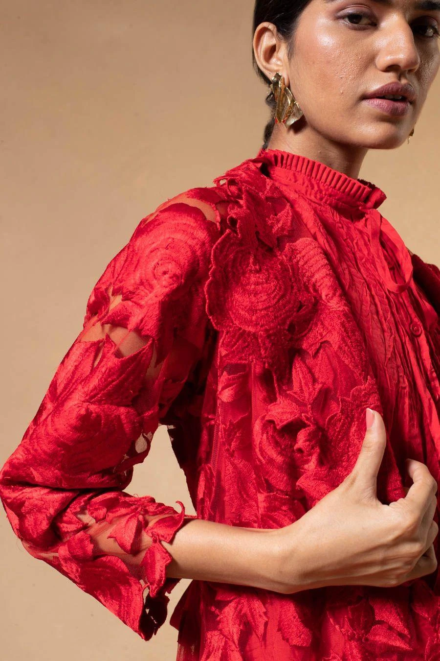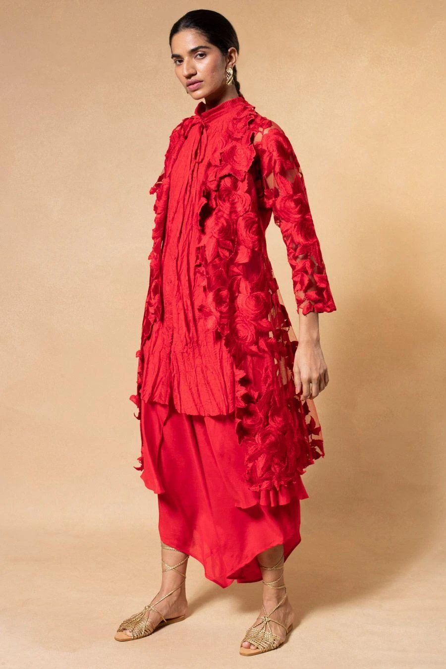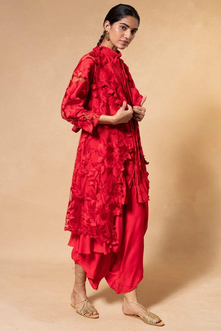 This habutai silk shirt, expertly crushed to enhance its allure comes with low crotch pants crafted in shantoon & Aikeyah’s signature floral thread embroidered overlay, creating a harmonious symphony of colours & textures that is simply breathtaking.