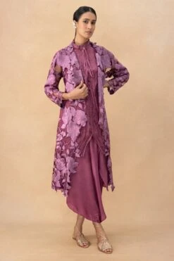 This classic monotone embroidered layover is accentuated by the gentle yet striking floral embroidered roses. This sophisticated piece is elegantly paired with a chanderi asymmetric top & flap pants.