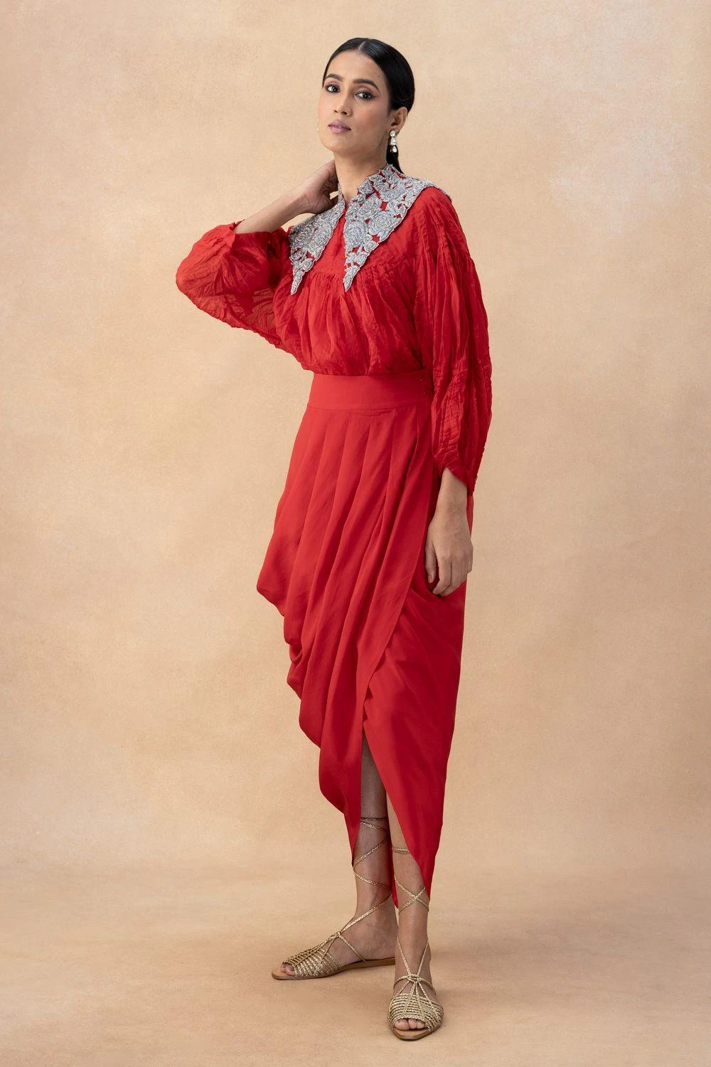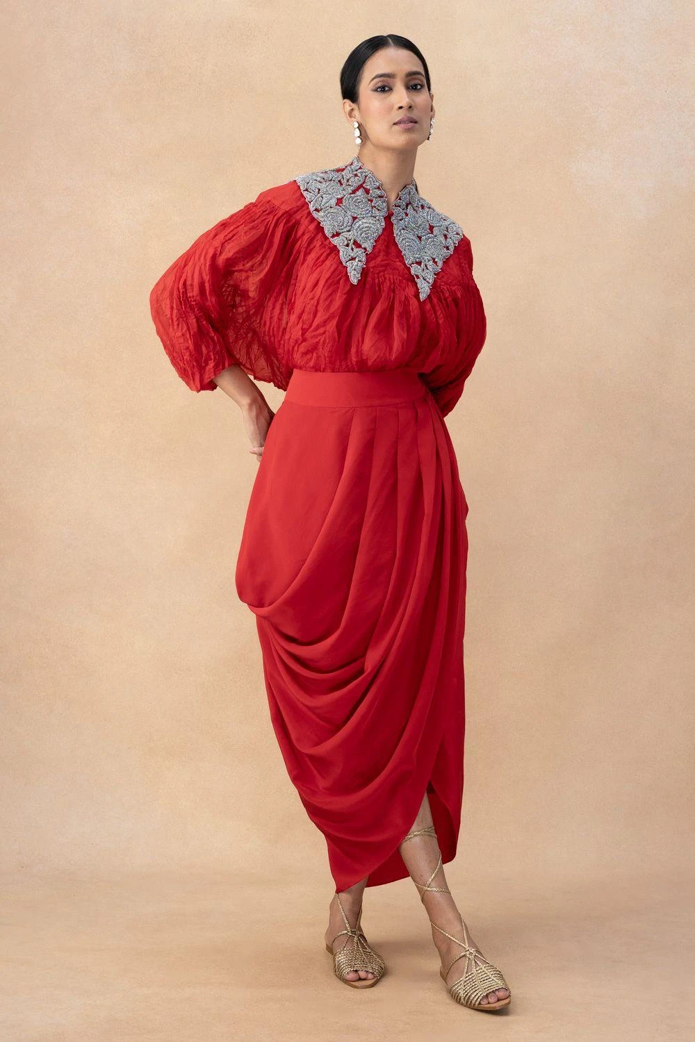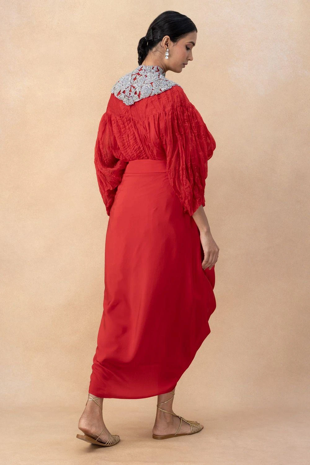 Step into sophistication with this red organza crushed top, elegantly tucked into a crepe cowl skirt. The piÐce de rÒsistance is the pewter glass beads hand-embellished collar, adding a touch of artistry and glamour.