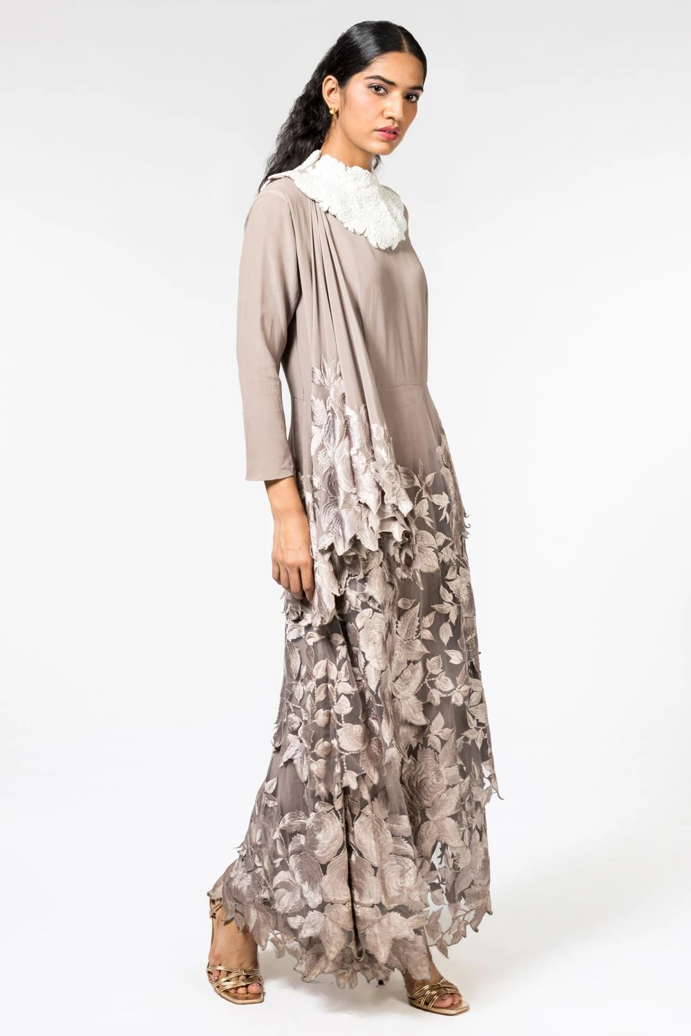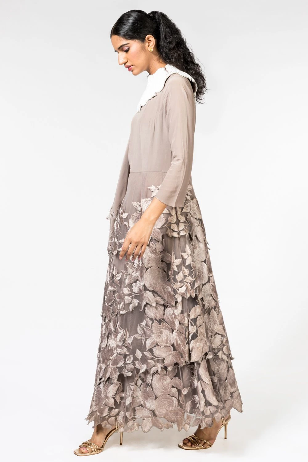 This nude pink dress exudes understated glamour and lasting elegance. It is deftly made in silk & tulle base and adorned with intricate silk thread embroidery all over. This dress is accentuated with an extravagant white collar that comes along.
