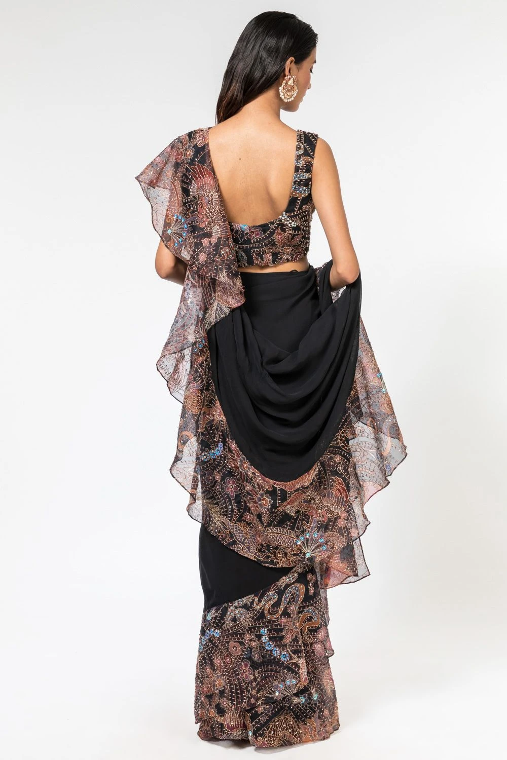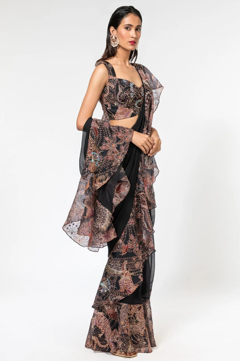 Grace the six yards of elegance in style & splendour with Aisha Rao. Featuring a black tropical printed & embellished ruffle sari, perfect for a fanciful destination wedding. It comes with a matching ornate blouse that perfectly complements the sari.