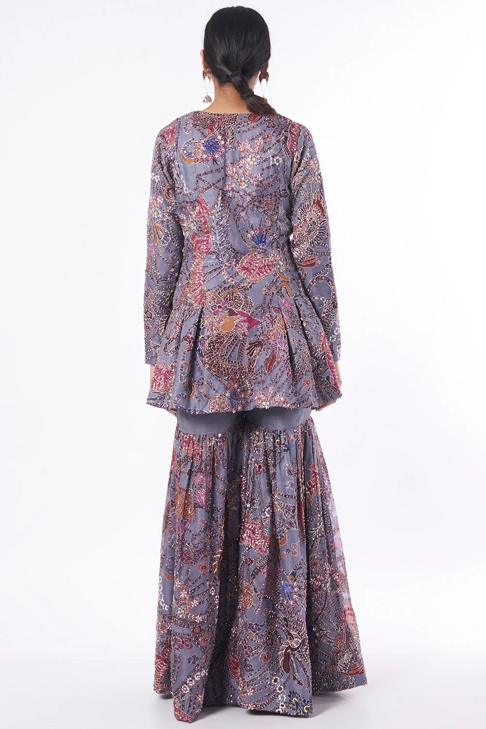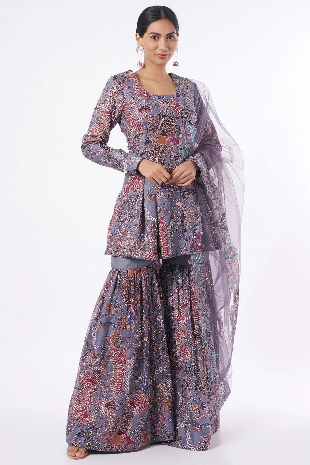 This grey sharara set is designed to suit every season and festive mood. It is made out of Indian organza and tulle. Style it with a dainty choker and jhumkas for a classic festive look.