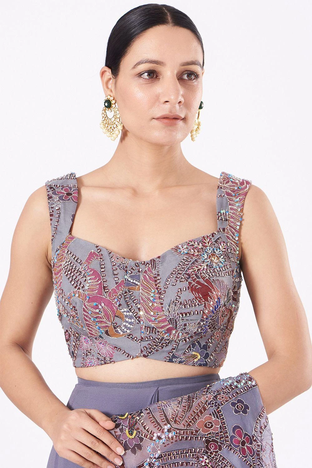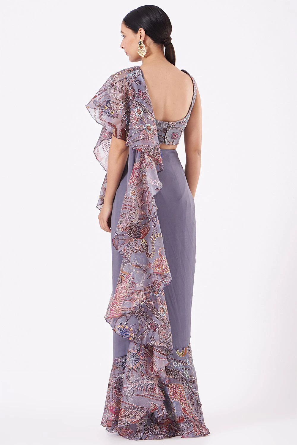This set features a grey ruffle sari along with a matching blouse. Printed, embellished and made out of georgette, this sari is perfect for a quintessential summer wedding look.