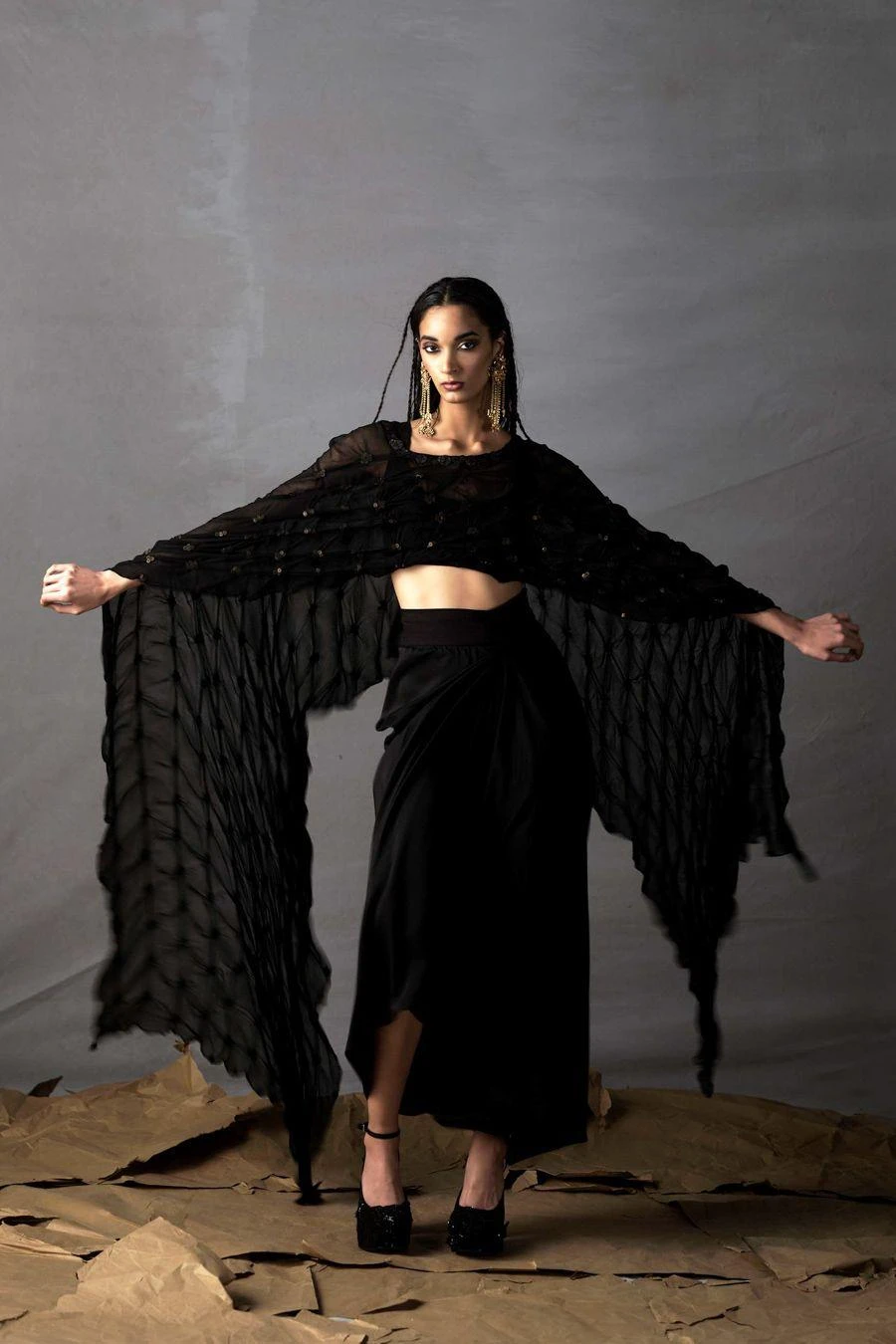 Look sartorially savvy with this black hued set. This set features a quilted dupatta cape paired with a crop top & a pickup skirt. Add a pair of dangler earrings to complete the look.