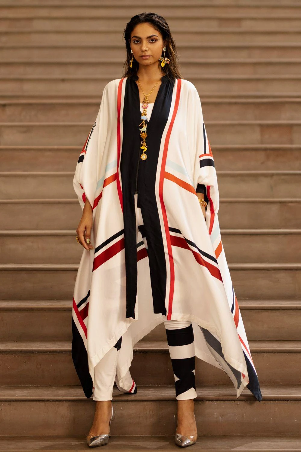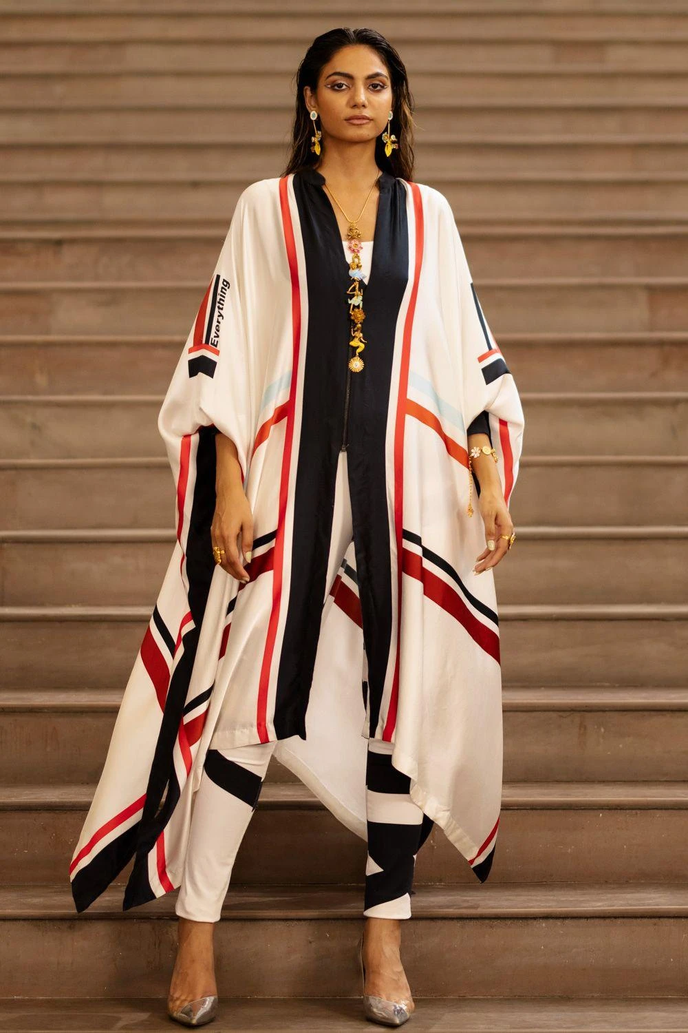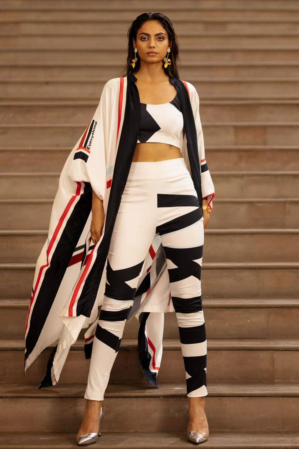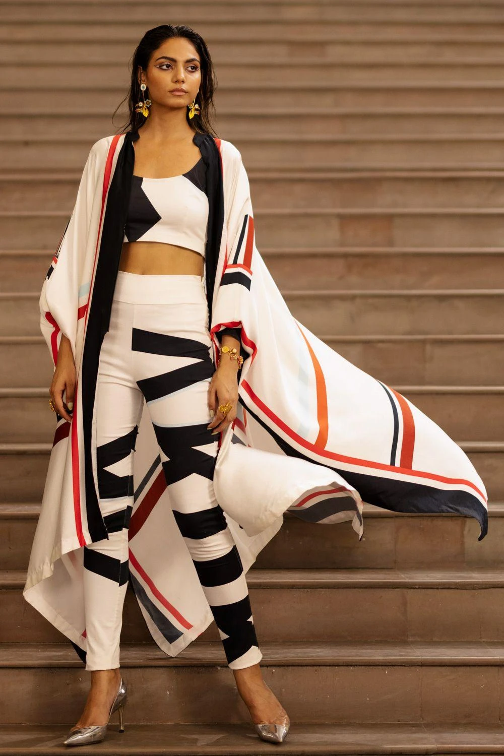 This Satin Striper Cape, Crop top, and Pants combo is an ode to your ultra-modern edgy style. The off-white satin cape is adorned with red stripes, adding a captivating contrast. The tube crop top and sleek pants boast black artistic stripes.