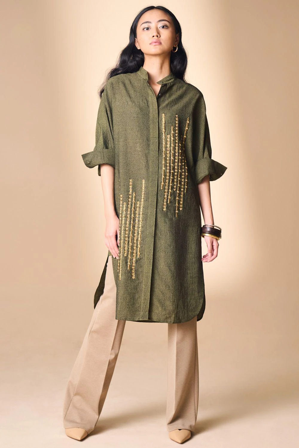 This easy & breezy moss green tunic in signature textured silk fabric is a classic piece to have in your wardrobe. The metallic embroidered front panels add a festive feel, making it a versatile piece.