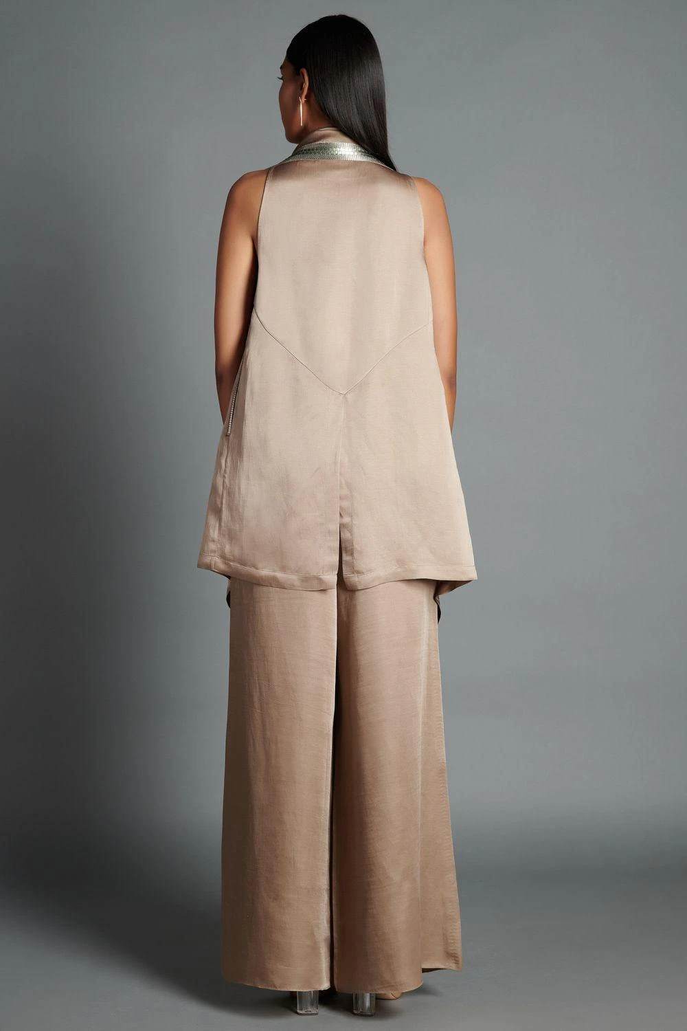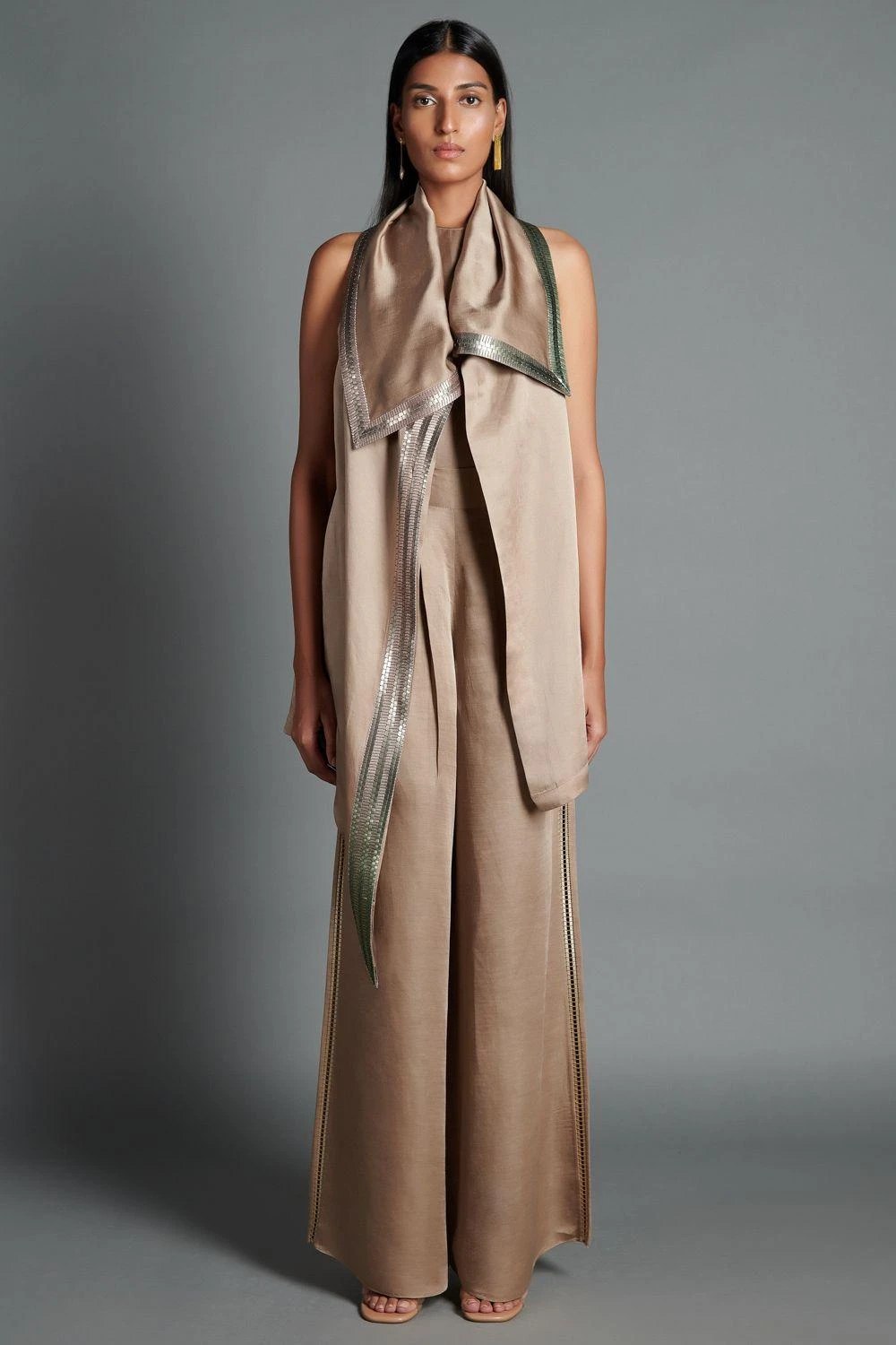This beige linen satin jacket set comes with flared high waist pants, a sleeveless top & an asymmetrical overlay with metallic details. This stylish monochrome set is perfect for dressy evening events.
