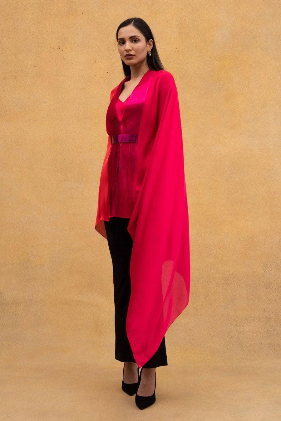 This panelled cape fetches ease & elegance at the same time. It is cut in luscious chiffon fabric and features hand woven metallic polymer yoke & placket and comes with a belt & inner. You can style it with a pair of tailored black trousers.