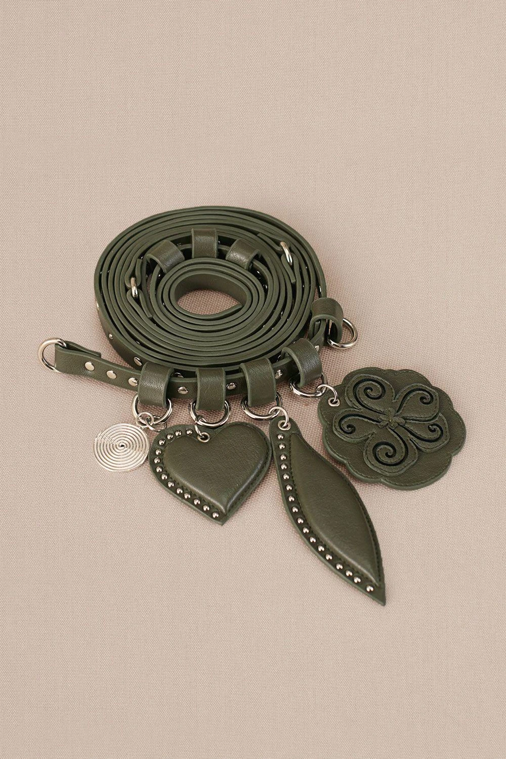 Discover elegance in Aafia’s olive triple-wrap belt adorned with laser cut studs and gold plated spiral charms. Elevate your fashion game with this chic and intricate accessory.