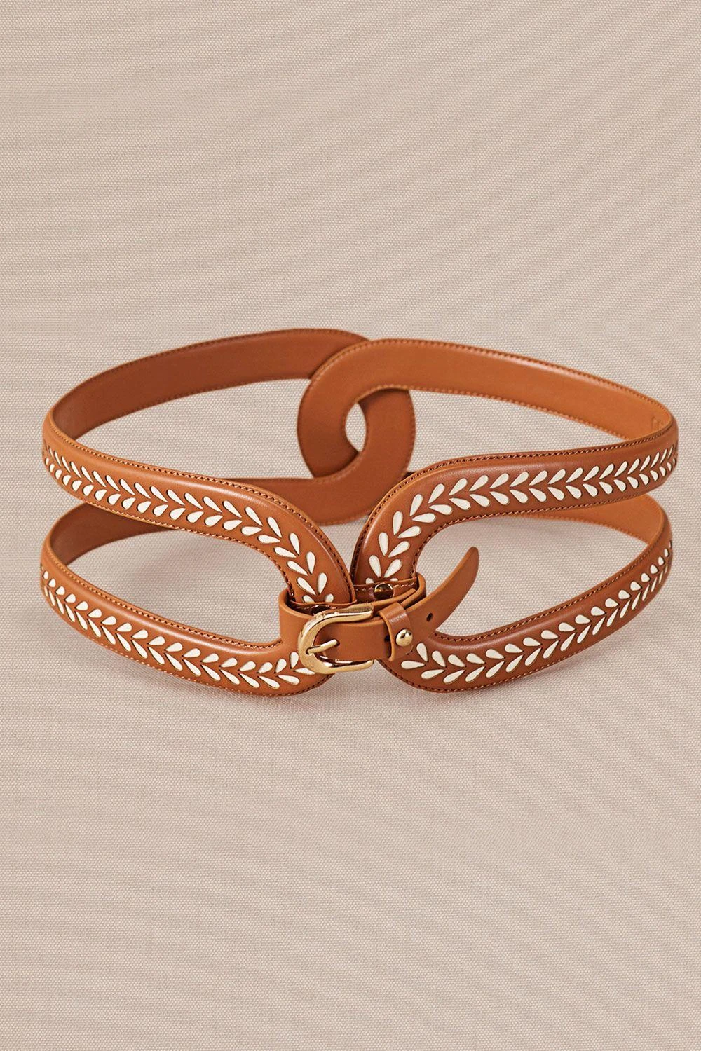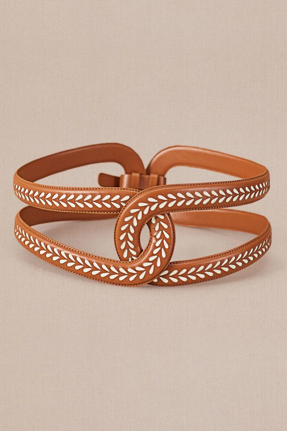 Step up your style with Adara, a tan corset belt intricately crafted in faux leather. Enhanced with silver rivets and a frontal buckle, it exudes elegance and sophistication.