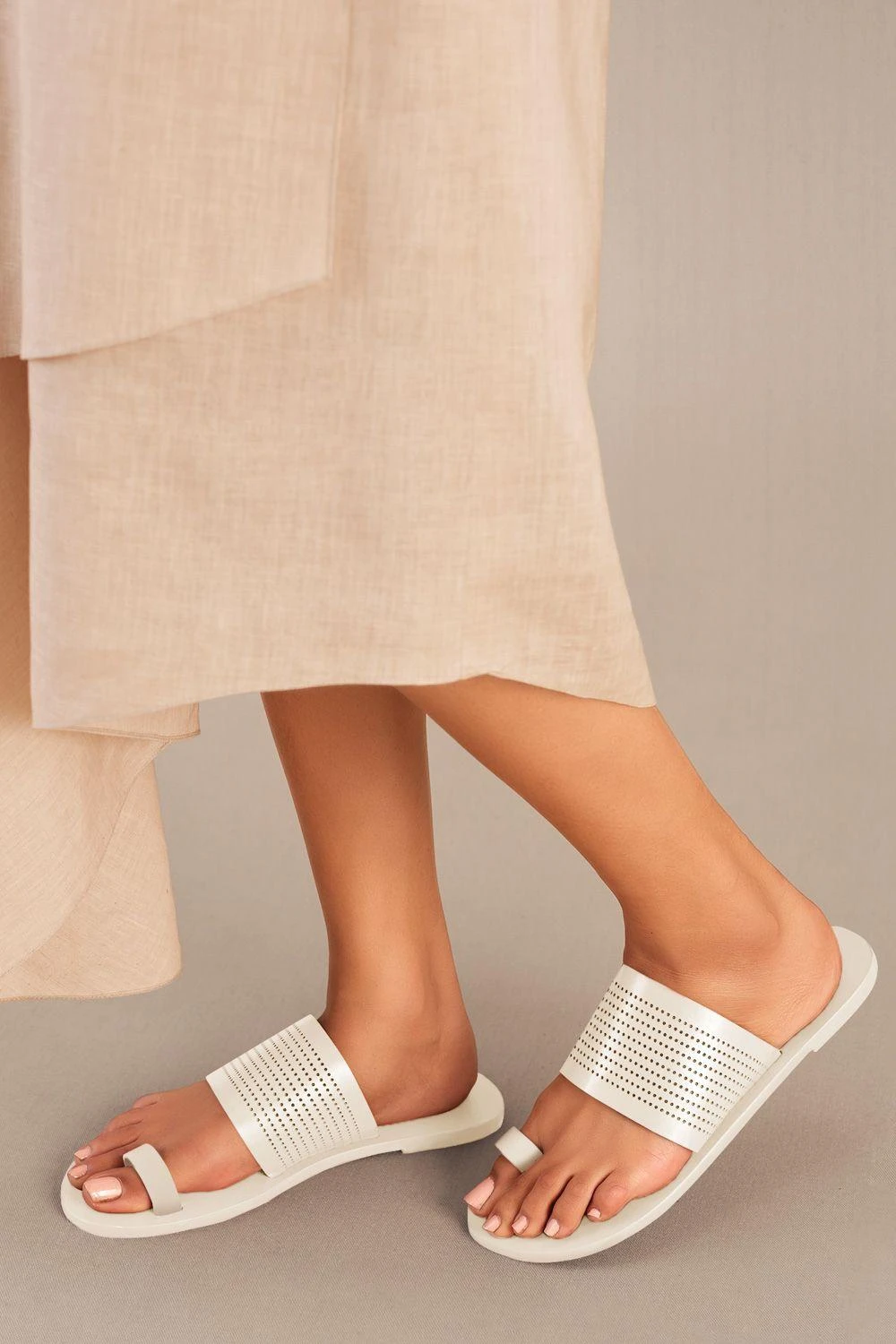Step into sophistication with the Lesha pristine white flats. Handcrafted in fine laser-cut leather, these open-toe slip-ons are your go-to companions, seamlessly transitioning from day to night.