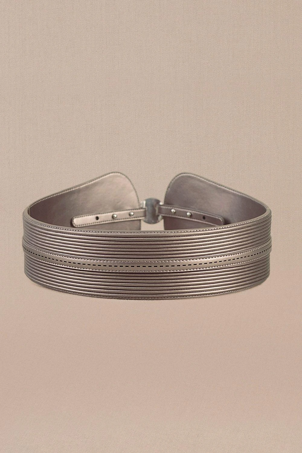Embrace opulence with the Ariana belt in metallic toosh corded faux leather. The intricate perforations & delicate enamel buckle create a statement piece that effortlessly merges style & sophistication. Elevate your ensemble with this chic accessory.
