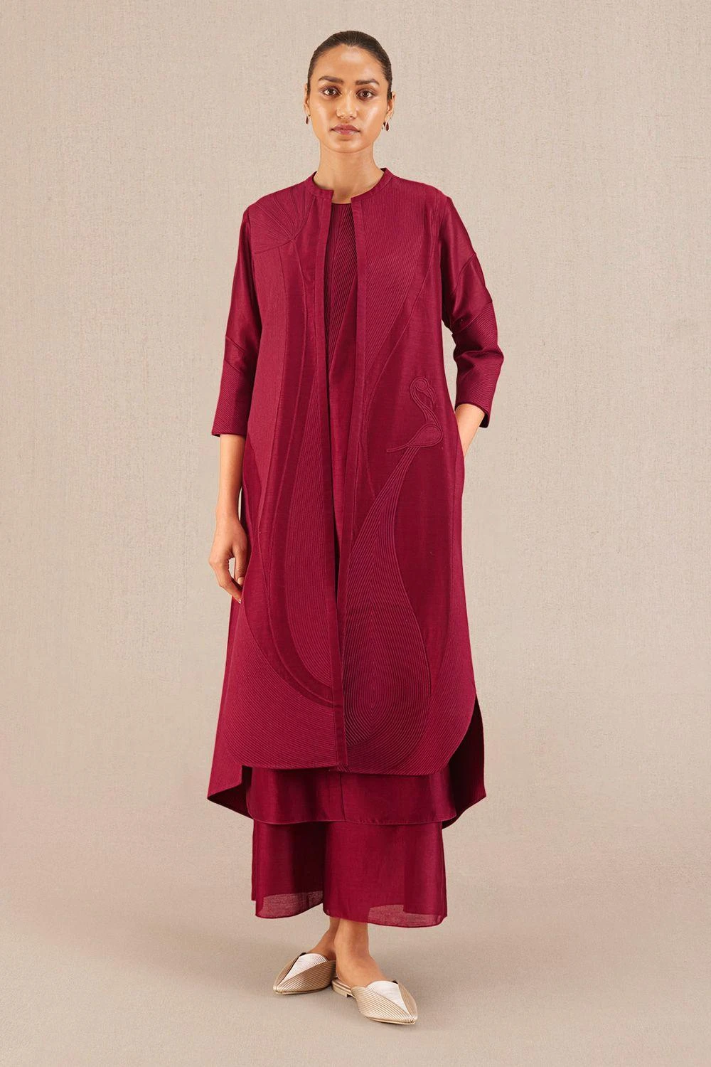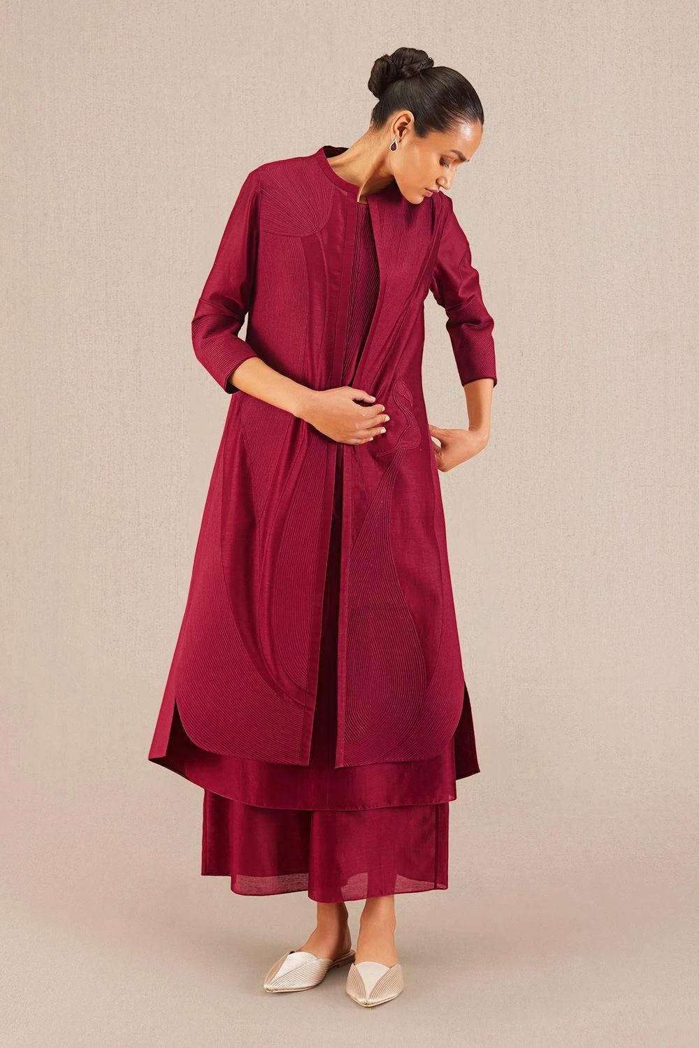 Luxurious in plush wine, this chanderi-silk ensemble features delicate embroidery & a relaxed silhouette, reminiscent of a leisurely summer afternoon. Paired with an inner & palazzo, its perfect for evening soirees or cultural events.