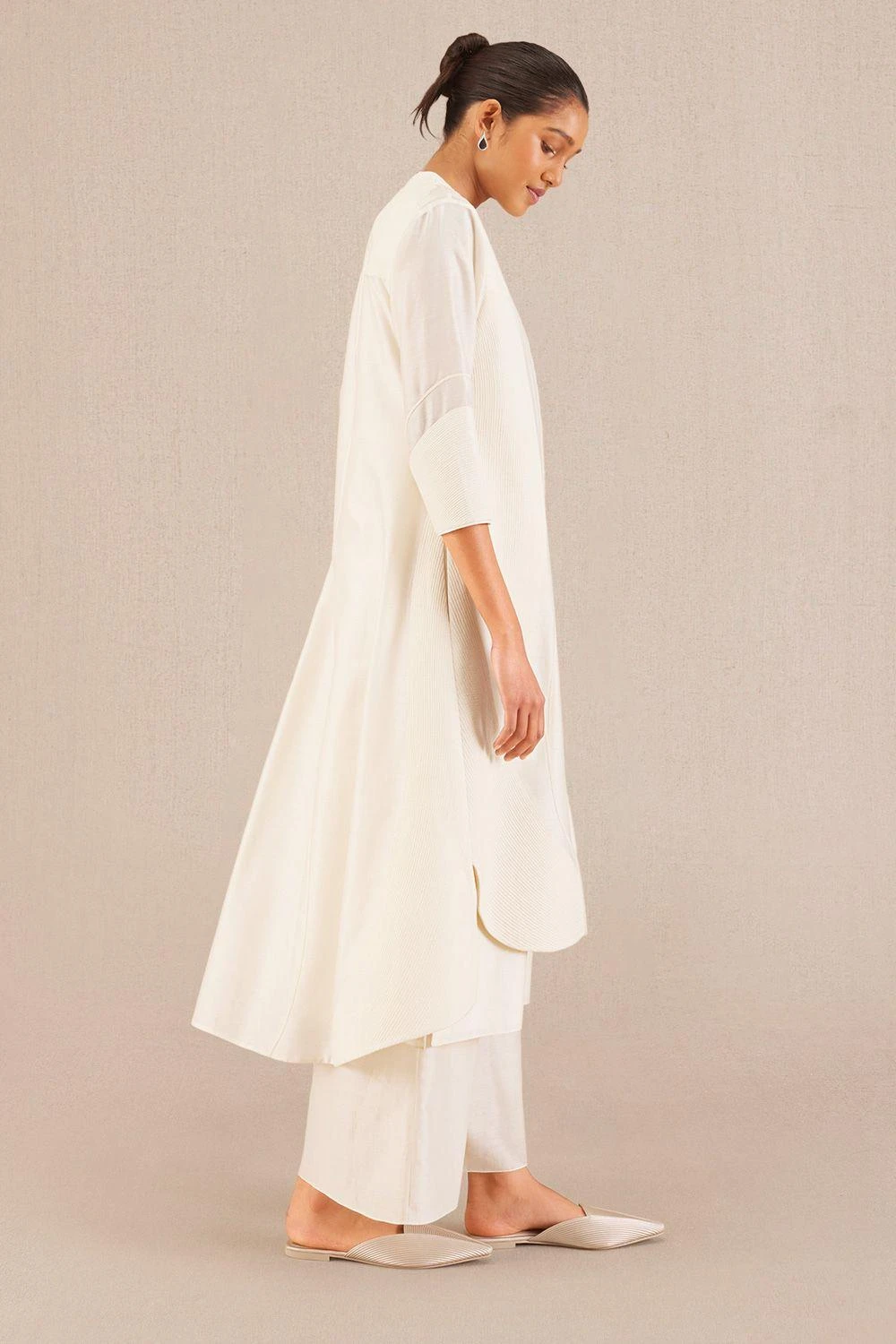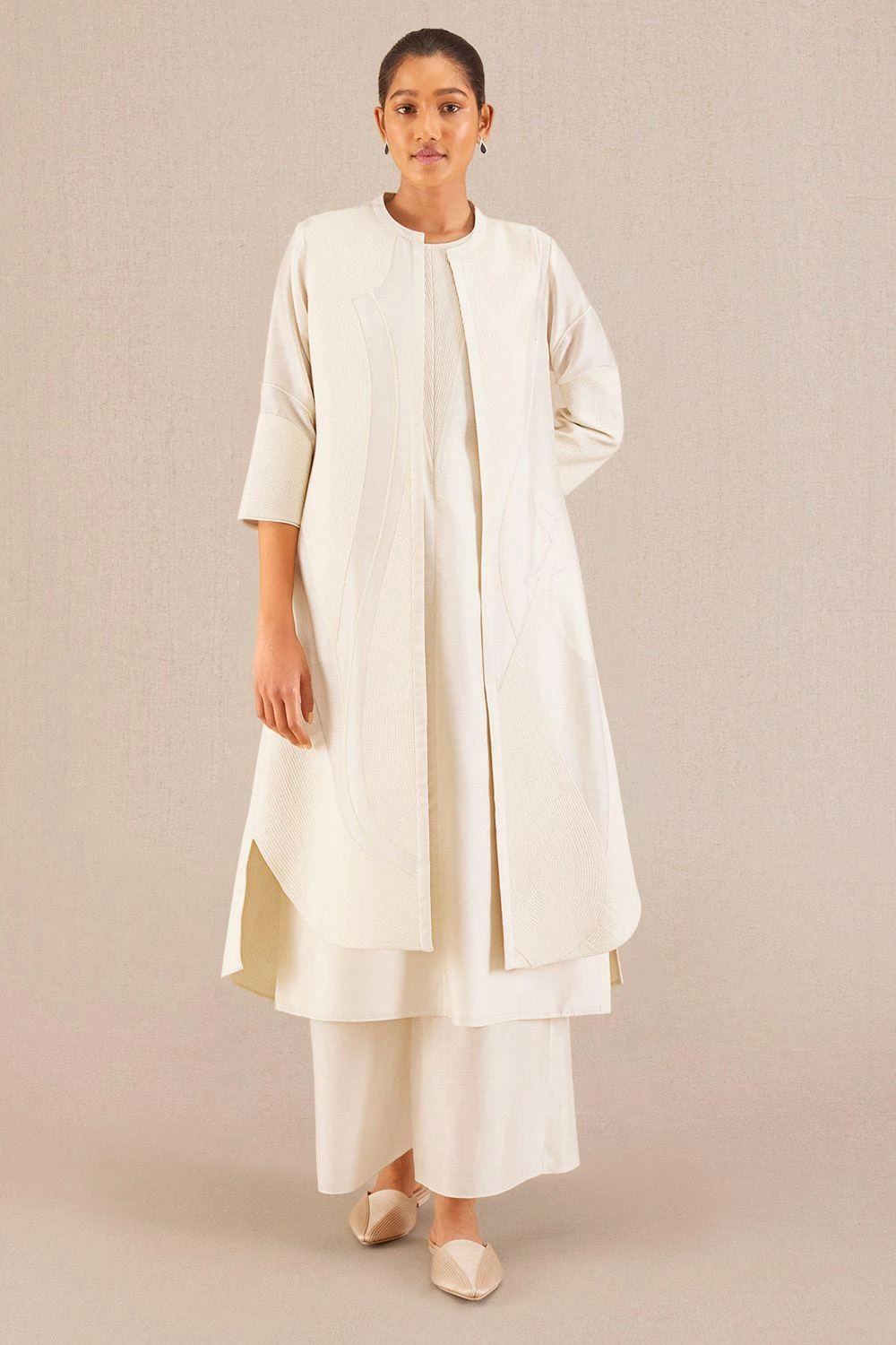 Gentle as ever, this chanderi-silk jacket set ensemble in soft ivory, adorned with delicate embroidery & a relaxed silhouette suits leisurely summer afternoons. Comes with an inner & palazzo, making it versatile for garden parties & brunch dates.