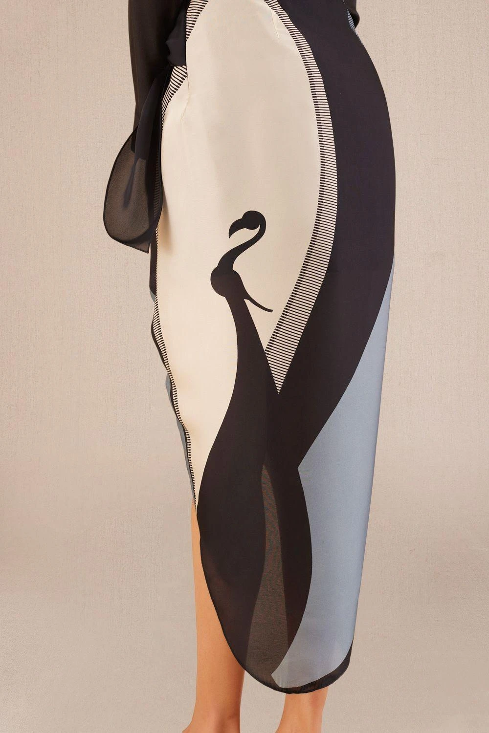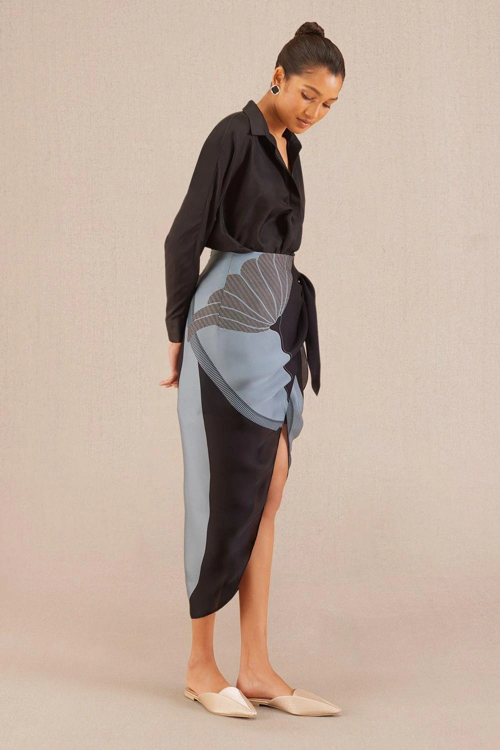 Discover summer’s allure in Nasreenùa silk shirt-skirt co-ord set in black, adorned with elegant motifs. A quintessential summer must-have, exuding grace in it’s soft silhouette. Embrace sophistication with this set, complete with a matching skirt.