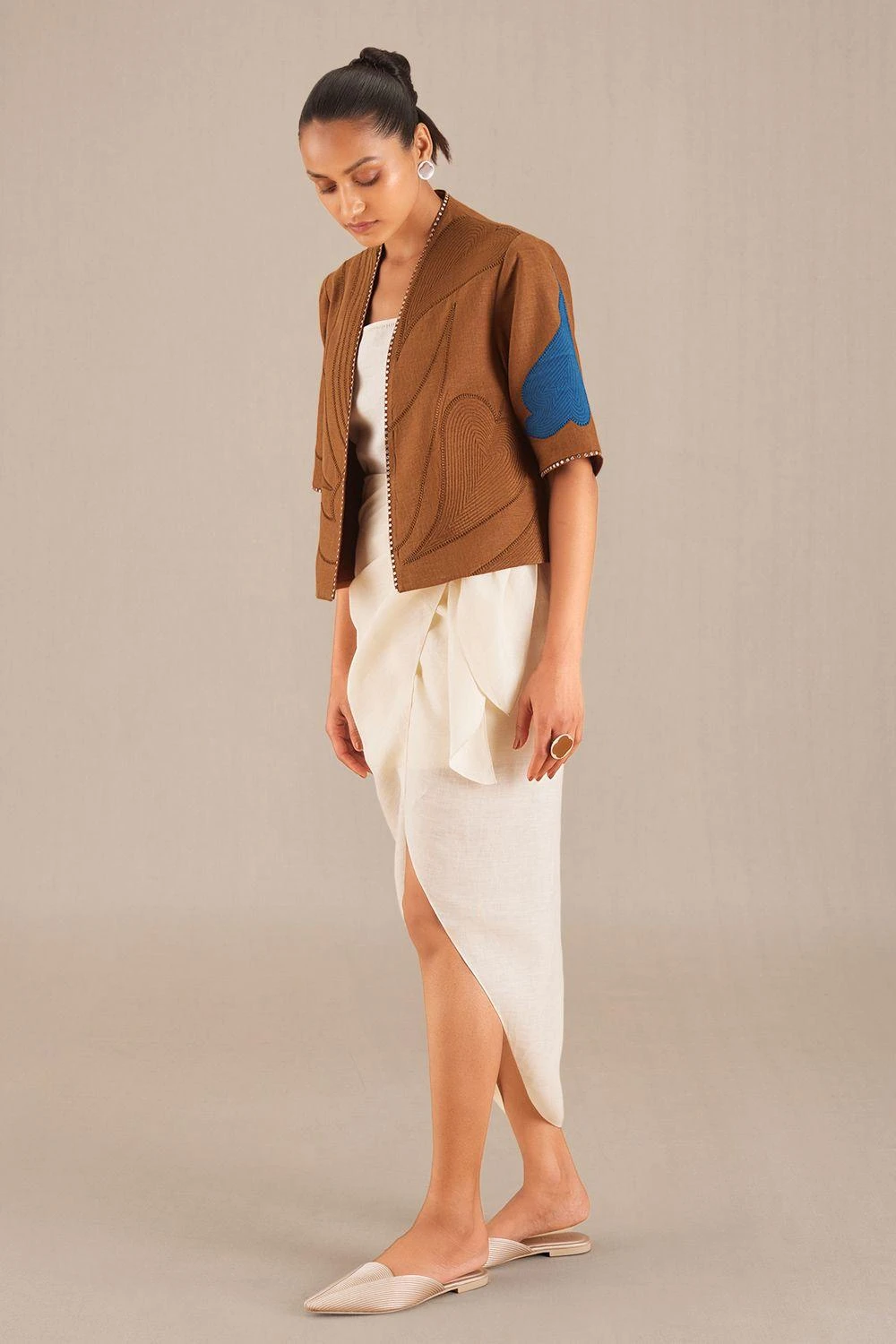 Sabaah’s brown linen jacket set, featuring teal leaf embroidery, transitions from boardroom to bar. Pair the set with the included skirt & inner. Opt for heels for a professional look or switch to chic flats for a stylish evening transformation.