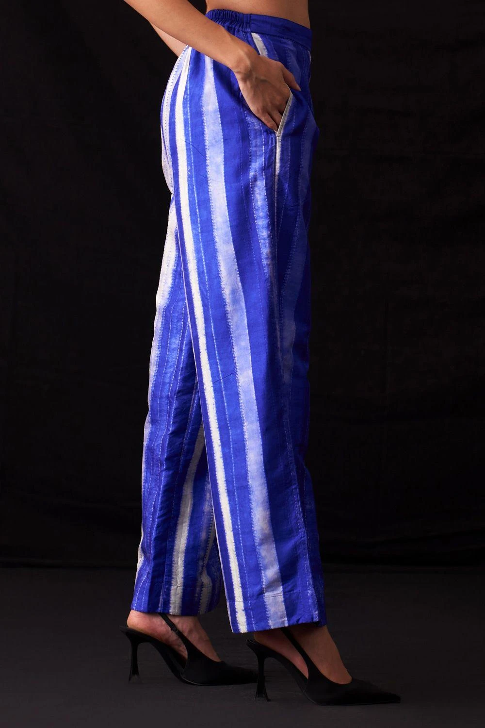 Crafted from luxurious hand-woven silk, these trousers showcase impeccable artistry through its hand-crafted shibori patterns. Elevate your style with this embodiment of elegance.