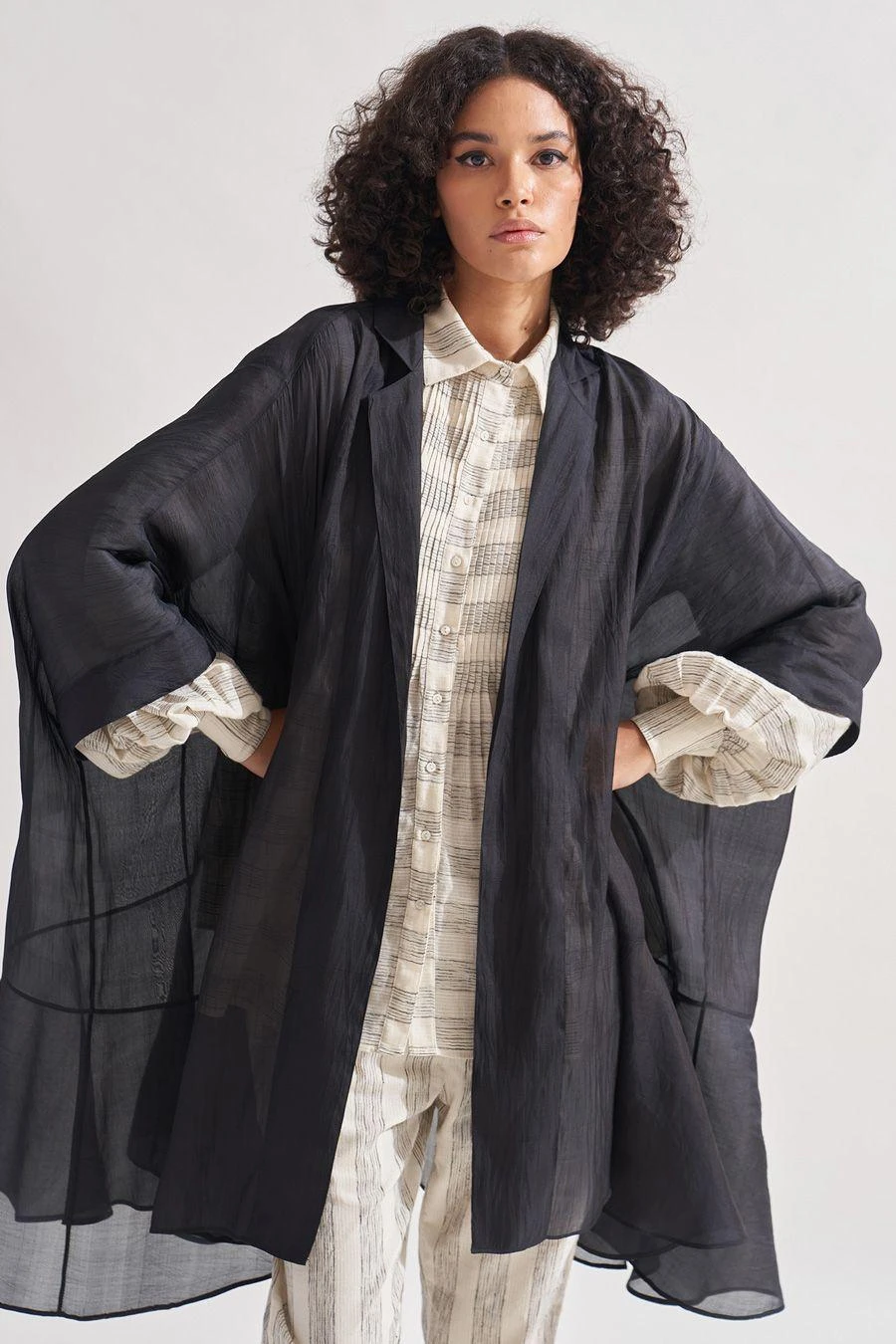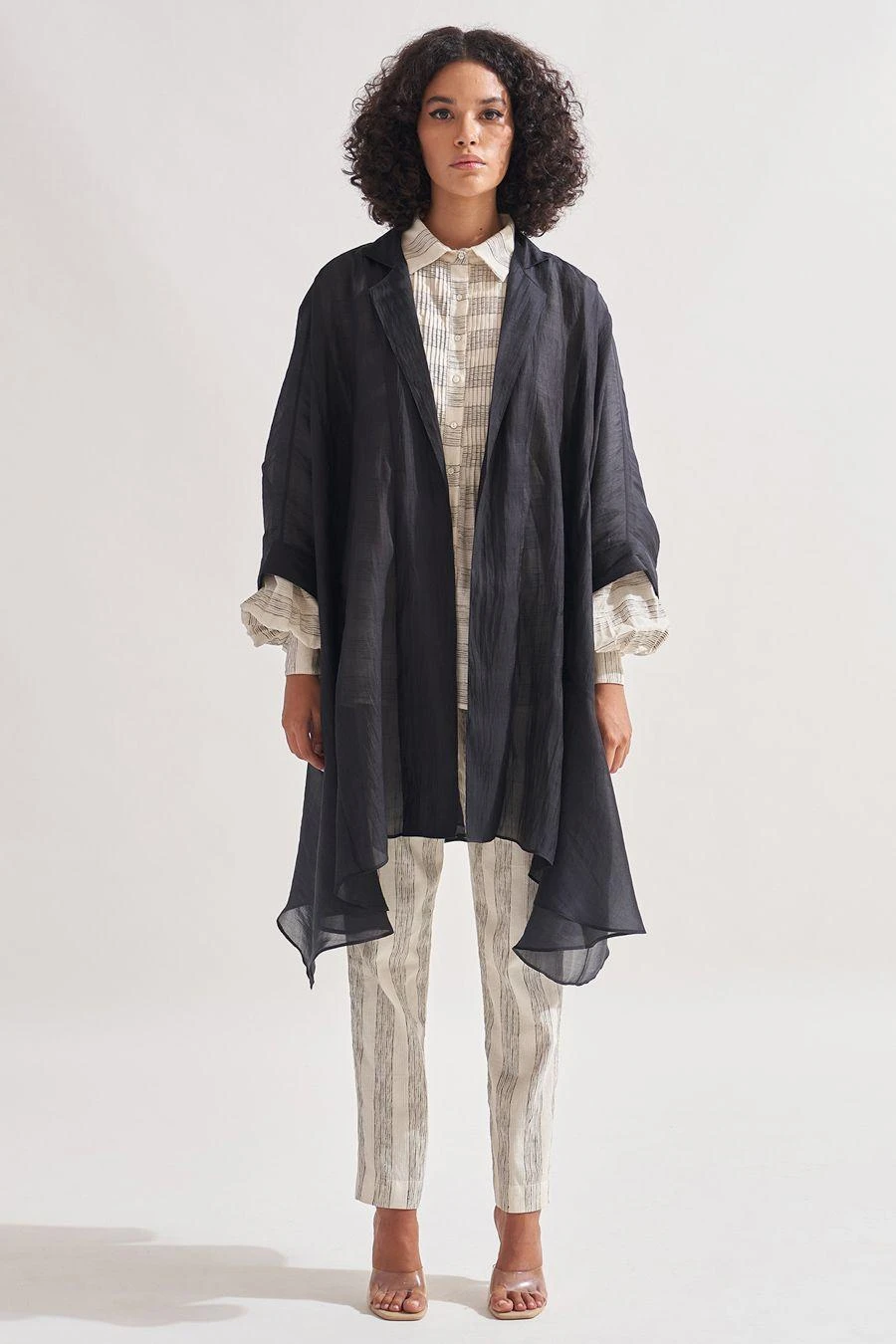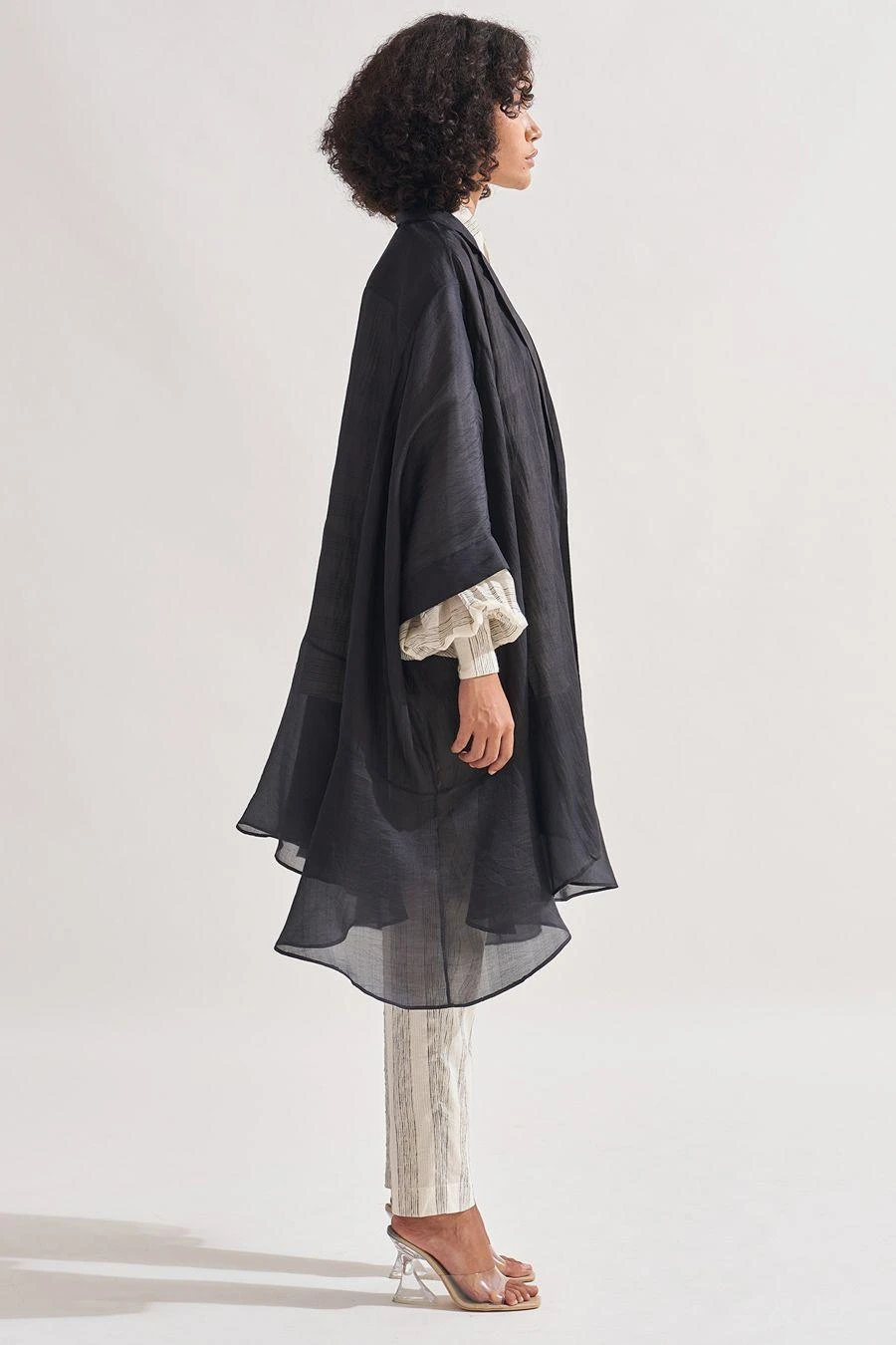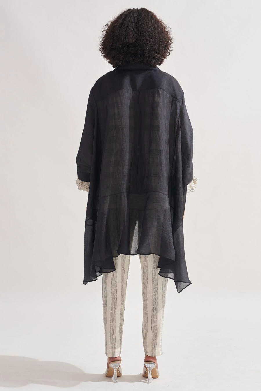 Look sartorially savvy with this black overlay Crafted in handwoven silk, asymmetric, panelled oversized overlay features 3/4th sleeves.