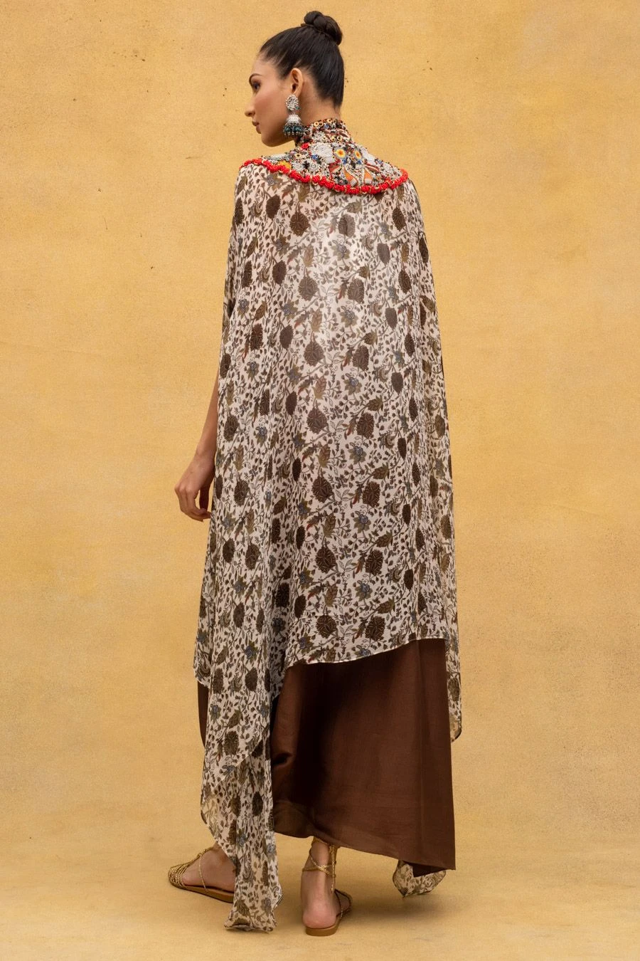 Contemporize your ethnic closet with this super chic & playful set. It features a printed chiffon cape with an embroidered yoke and tassels paired with a shaded dress. Adorn a pair of statement earrings to complete the look.