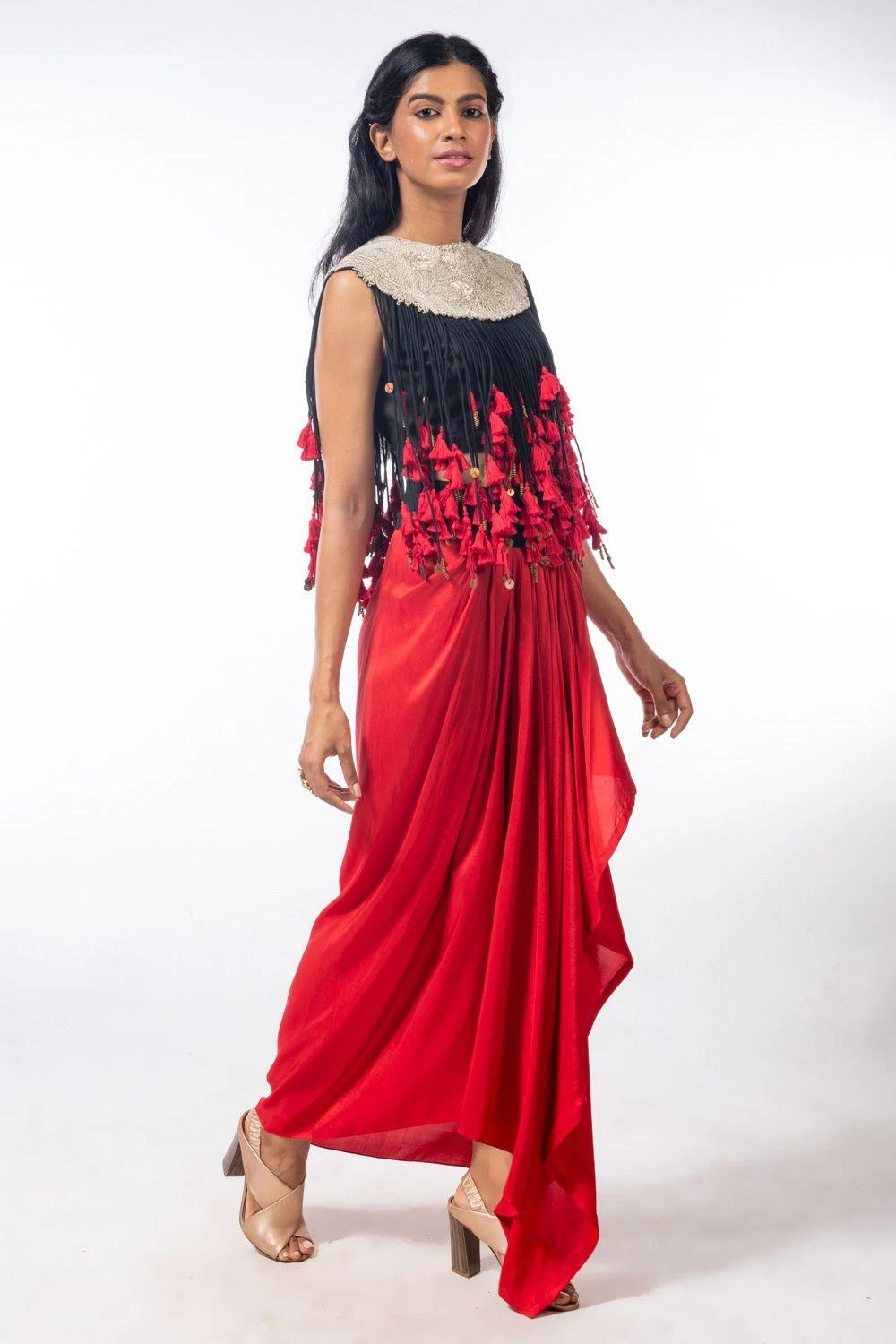 Make a head tuning statement in this fiery Anamika Khanna ensemble. It features a red drape skirt cut in sumptuous silk fabric paired with a black fringed top with an embellished neckline. Style it with a subtle clutch and a pair of heels.