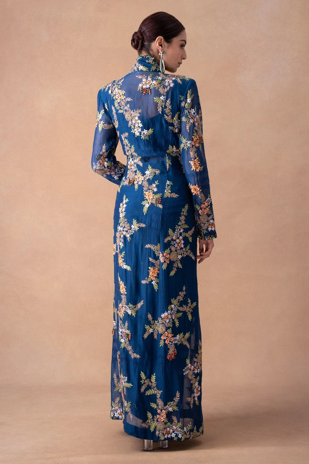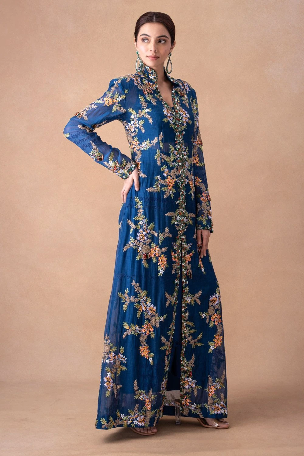 Radiate sophistication in this floral embroidered long jacket-skirt set! Crafted in luxurious silk, featuring a stunning long jacket, bustier & skirt, it’s ideal for formal events or elegant gatherings where timeless grace meets striking style.