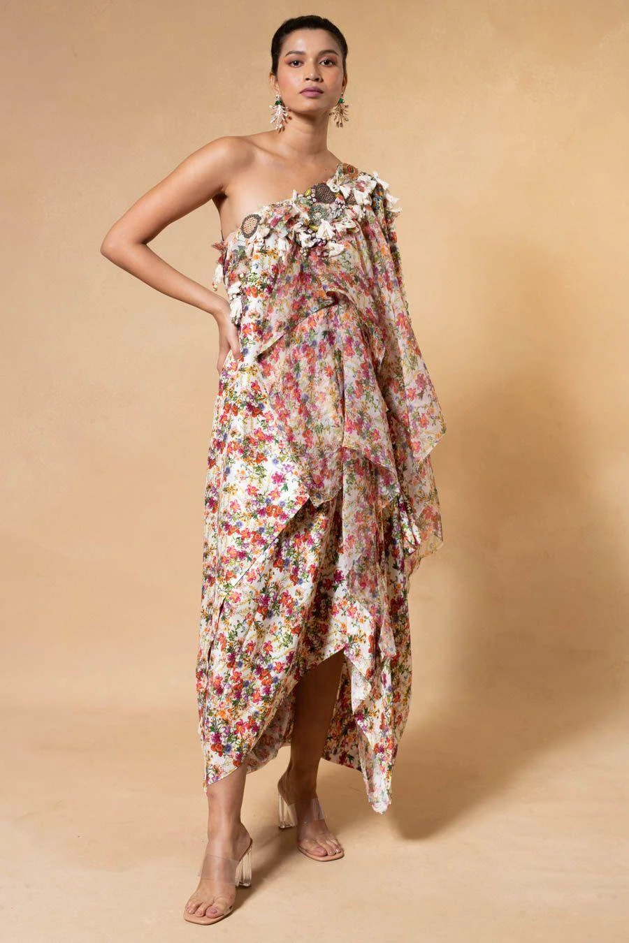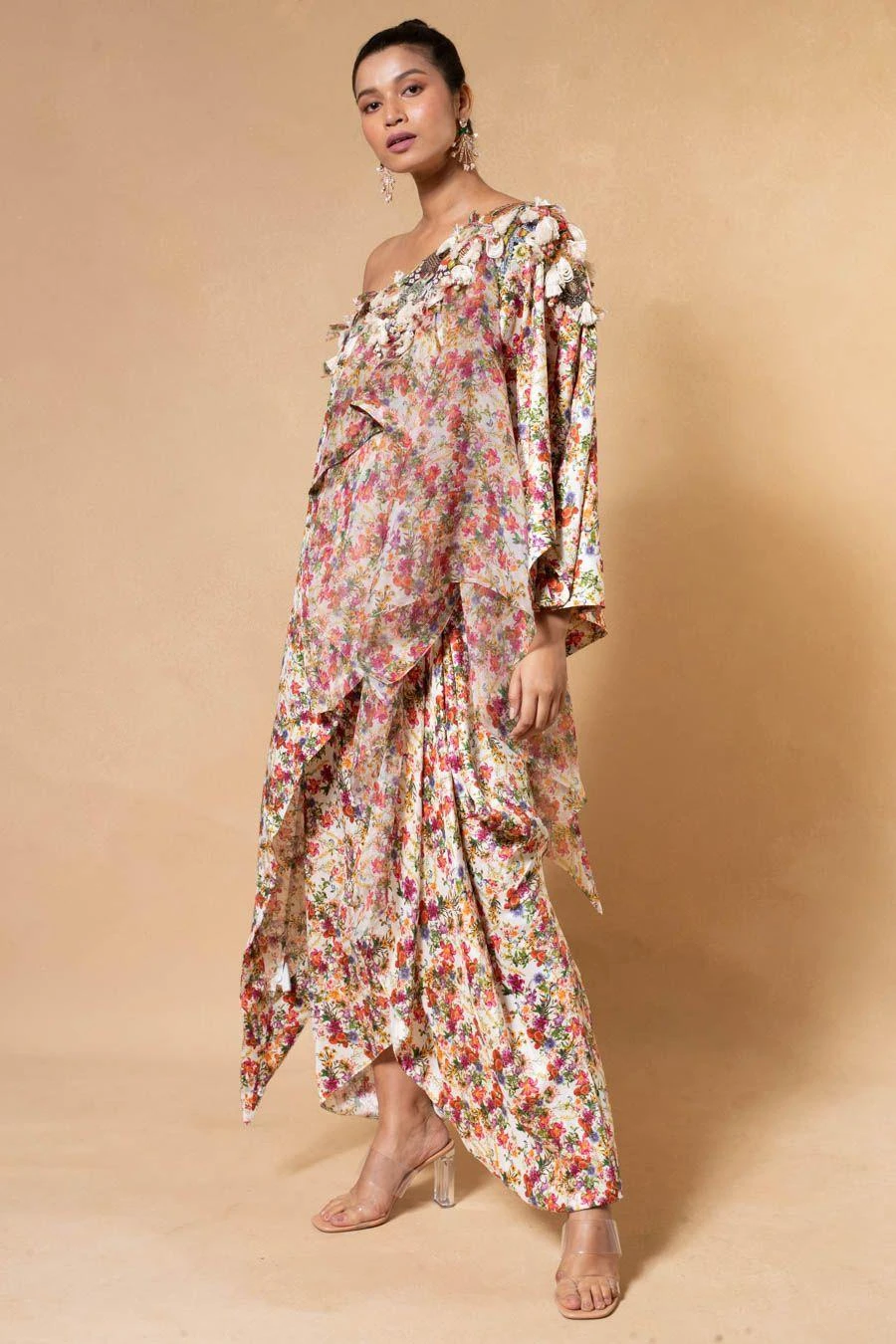 Look effortlessly stylish with this tunic set. Crafted in silk, this set features a fully embroidered one shoulder top paired with a draped skirt. Add a pair of statement earrings to complete the look.