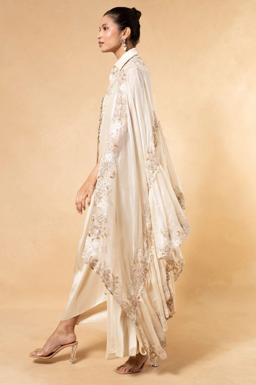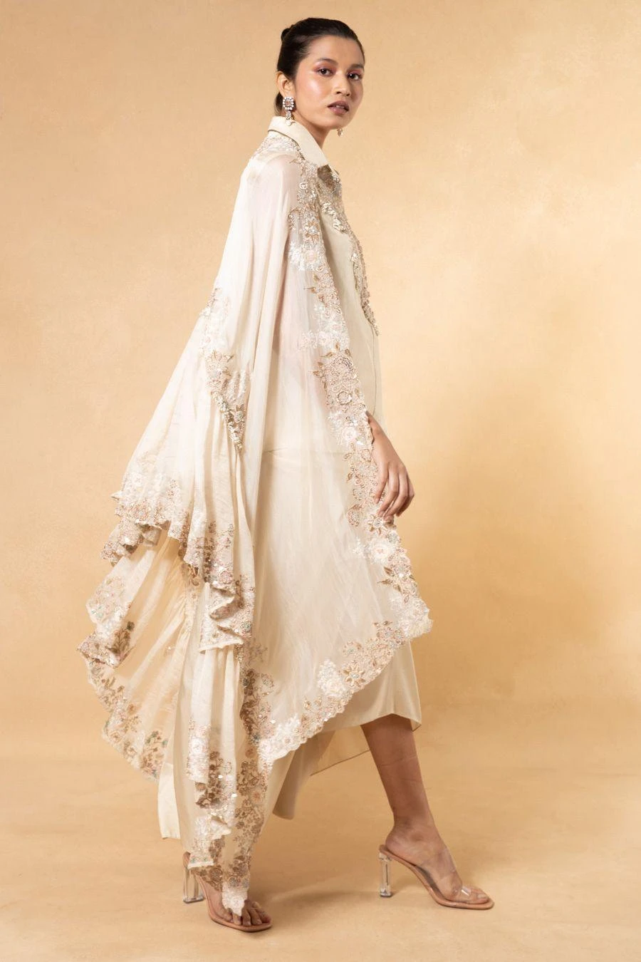 Contemporize your ethnic closet with this super chic & playful set. Crafted in silk, this set features a collared cape style shirt with intricate embellished details paired with a pick-up skirt