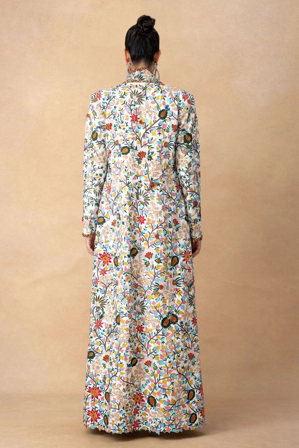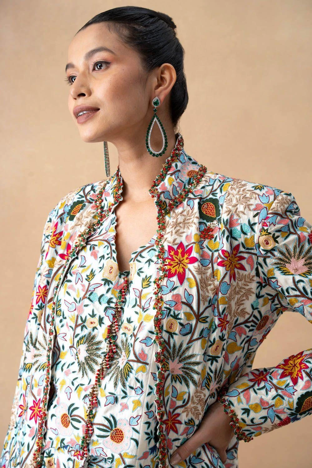 Indulge in elegance with this ivory multi-floral print long coat-trouser set! Crafted in silk, featuring a long coat, a top & trouser, it’s perfect for daytime events or semi-formal occasions where sophistication and style intertwine effortlessly.
