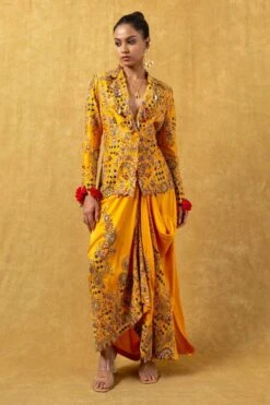 Contemporize your ethnic closet with this super chic & playful set. It features a thread embroidered short jacket paired with a draped skirt. Adorn a pair of statement earrings and a clutch to complete the look.