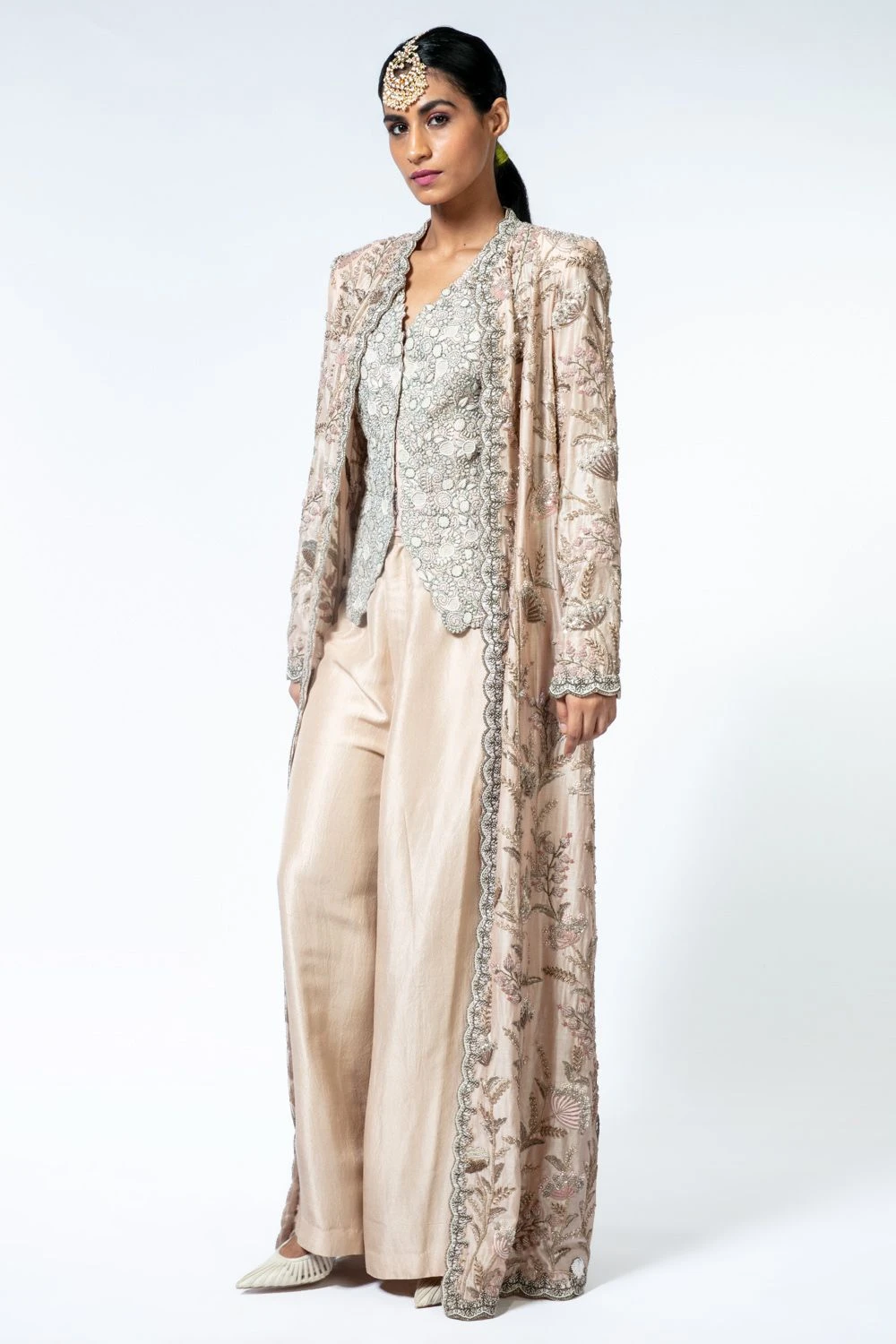 Taste the unconventional elegance with this pale pink jacket set. Cut in luxe silk, it features a long embroidered jacket complementing the subtle ivory top & wide legged pants. You can style this with a pair of emeralds for an engagement look.